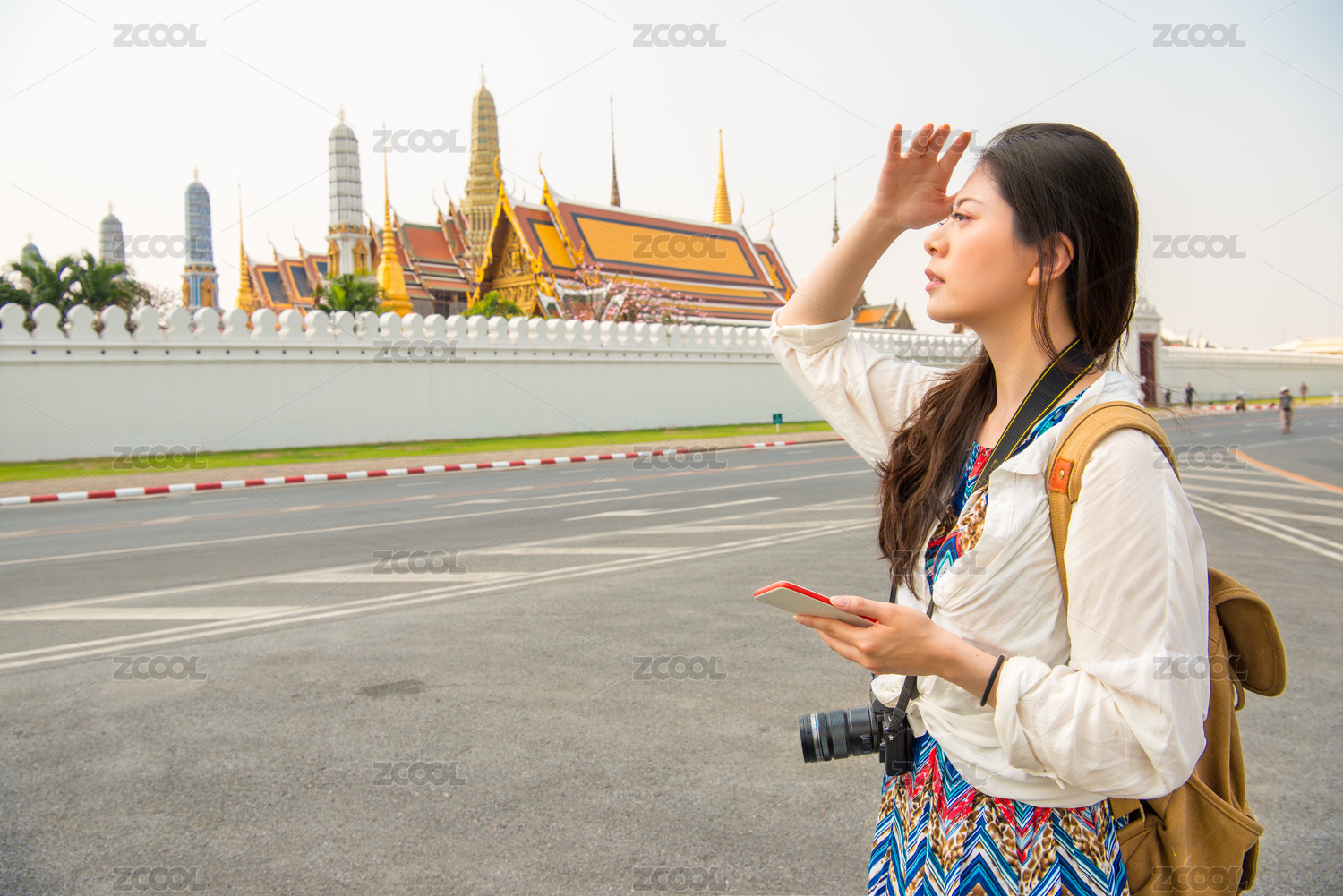 在泰國的大皇宮女游客,旅游夏季旅游尋找與智能手機的觀光地點??鞓返男∨⒂^曼谷著名的旅游景點熱門目的地。