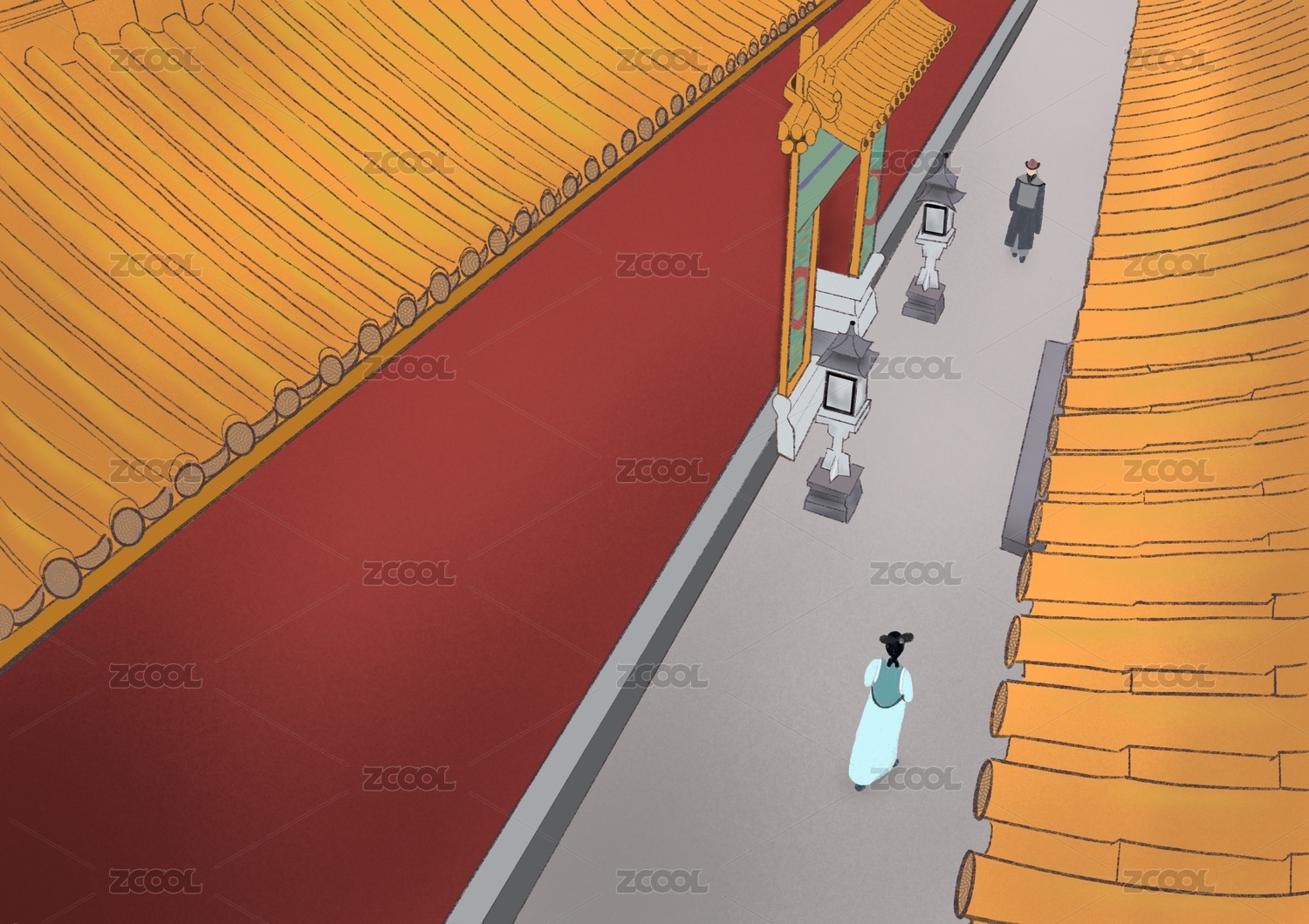 皇宮的紅墻黃瓦的走道上宮女和王爺迎面相遇