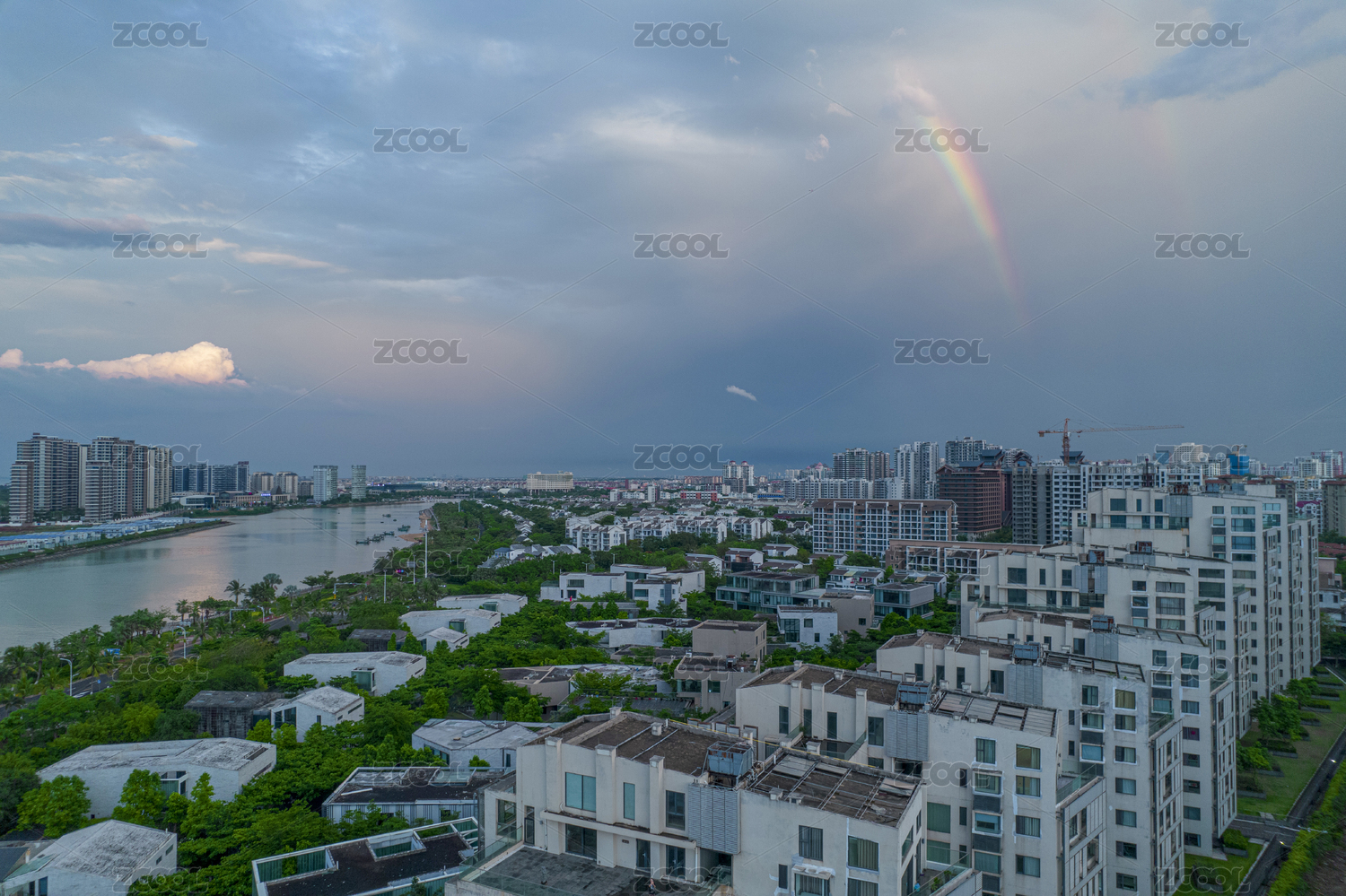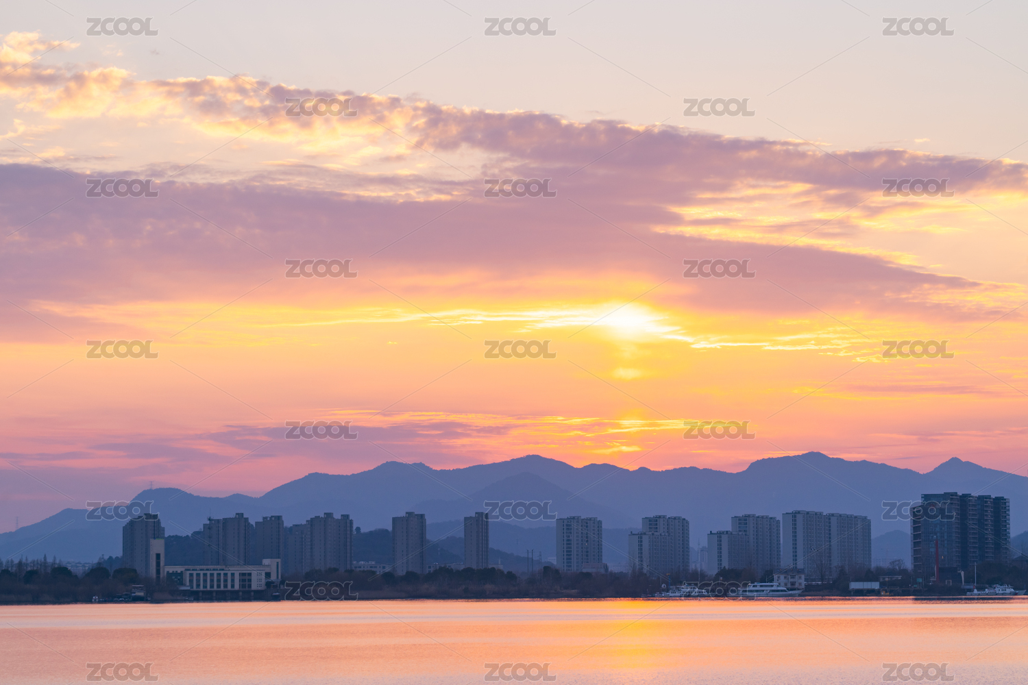 落日黃昏日柱天象下的杭州之江版塊城市建筑
