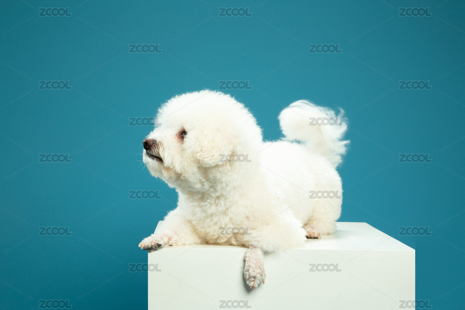 趴在木箱上眼睛看向一邊的巴比熊犬純色背景