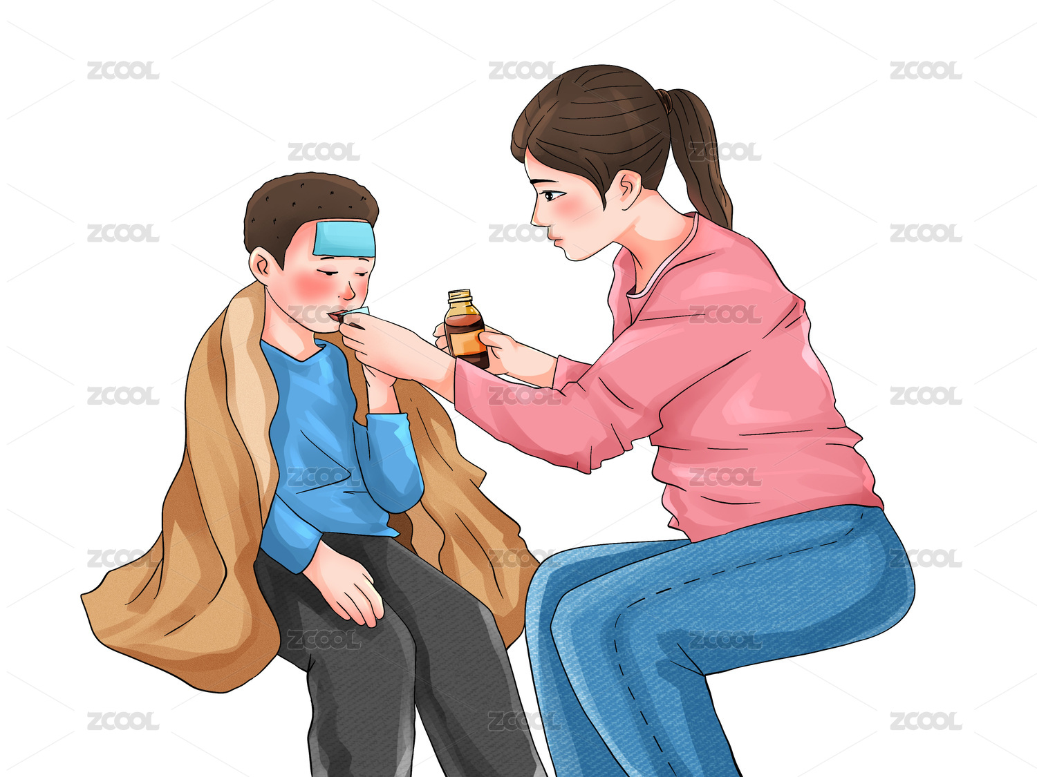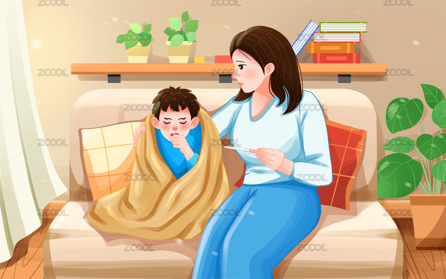 媽媽給感冒發(fā)燒的孩子測體溫插畫