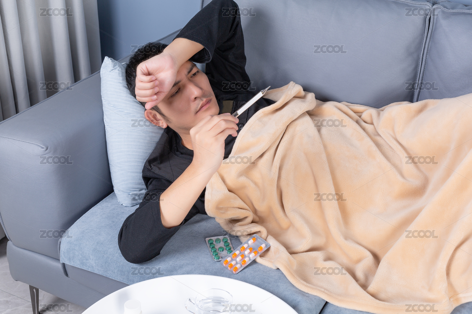 發(fā)燒躺在沙發(fā)上看體溫計(jì)的男人