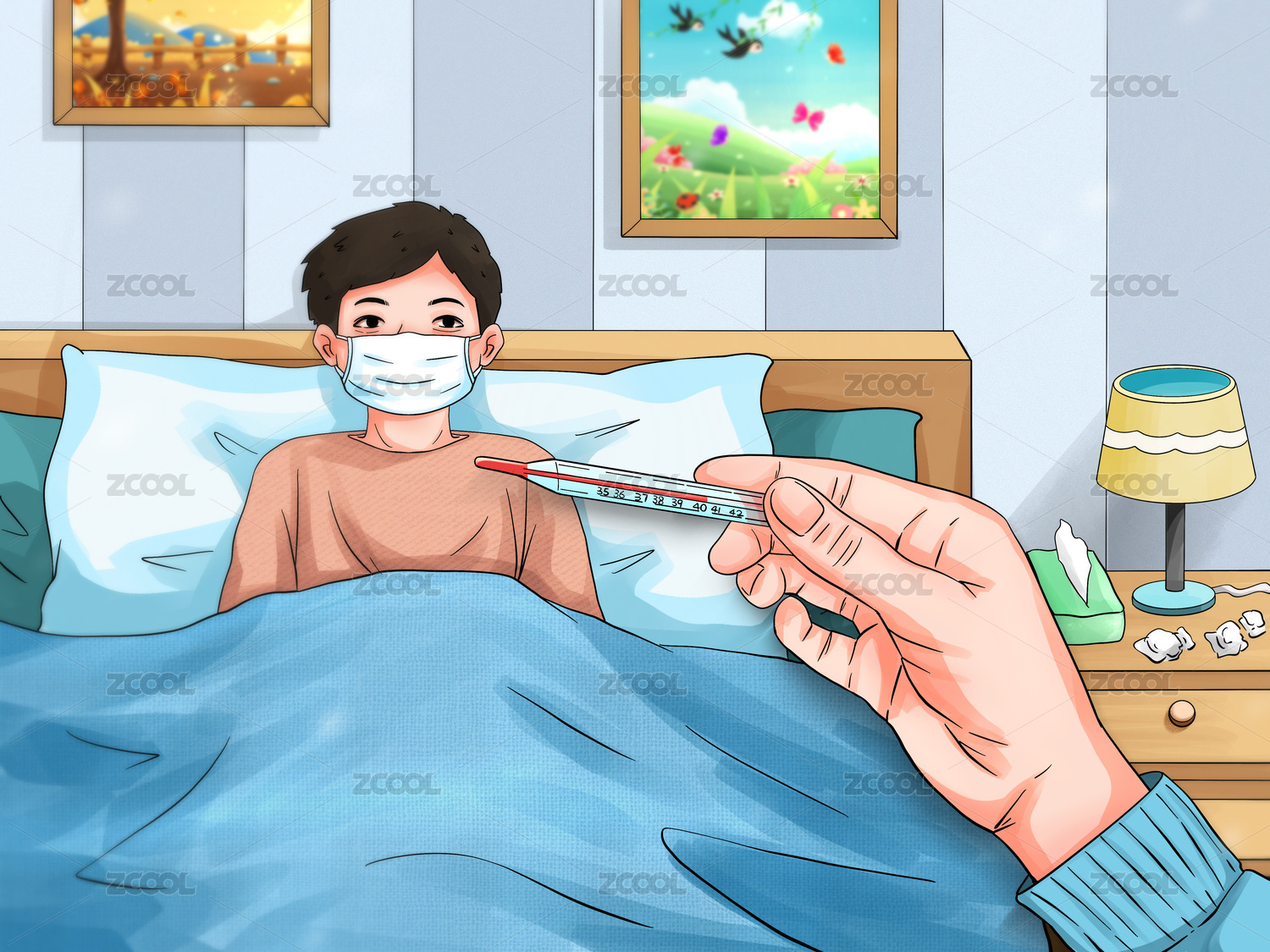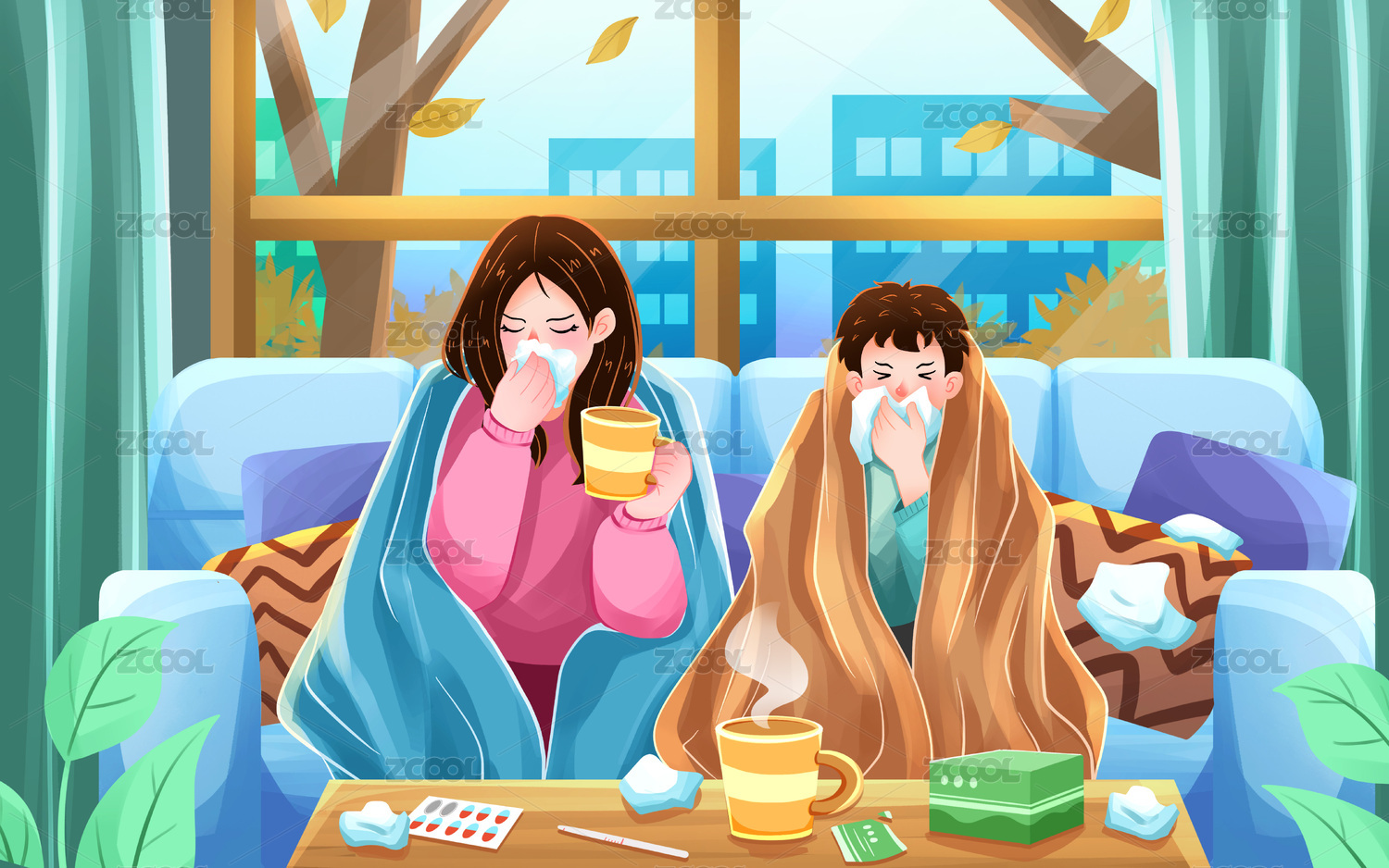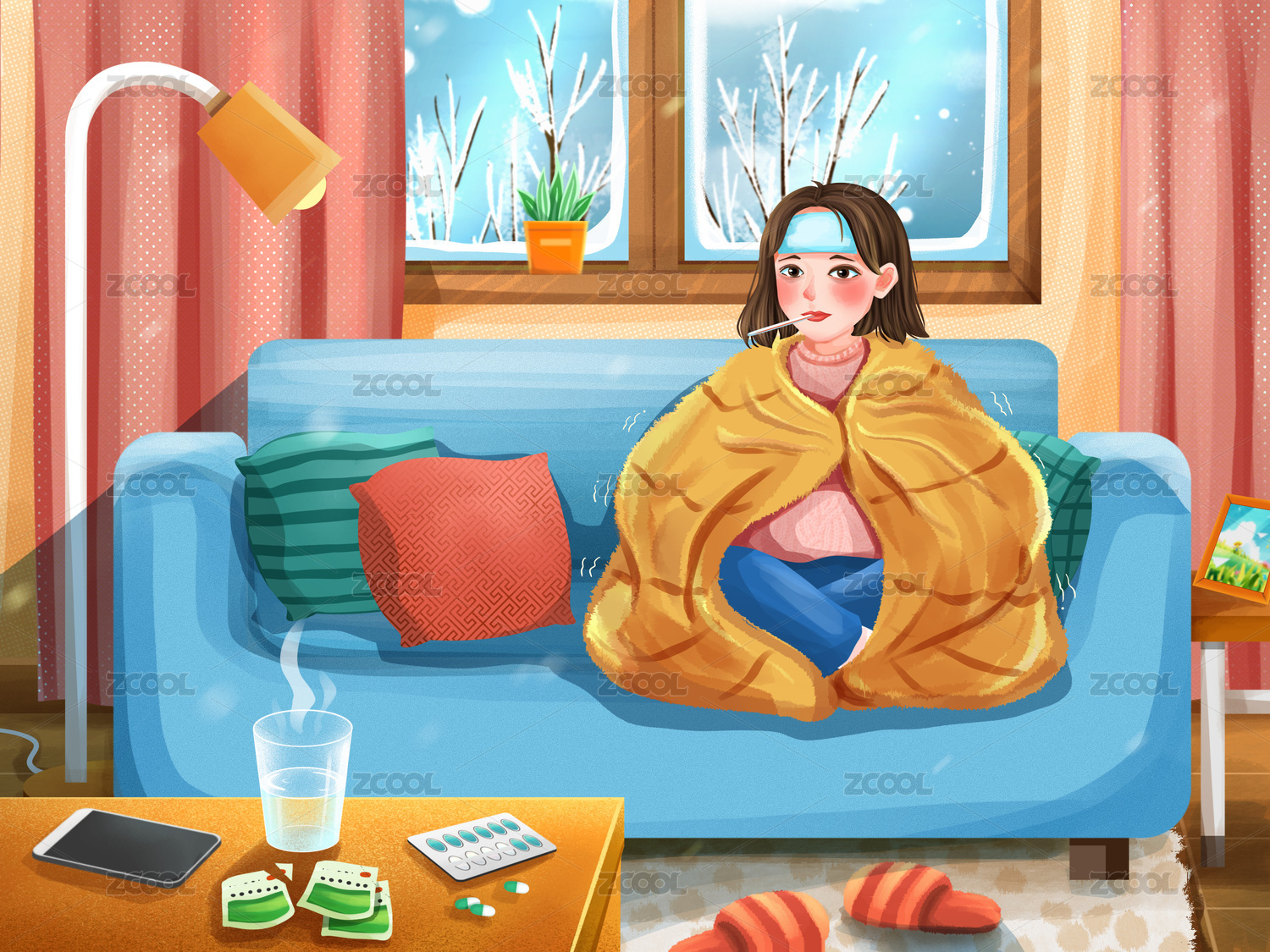 秋冬降溫流行感冒發(fā)燒插畫