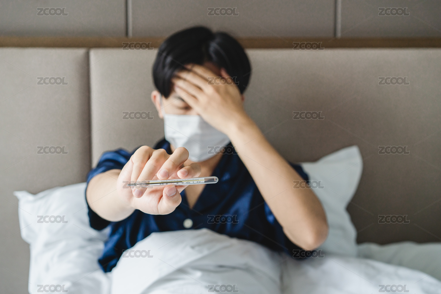 亞洲發(fā)燒男子戴著口罩臥床拿著體溫計(jì)