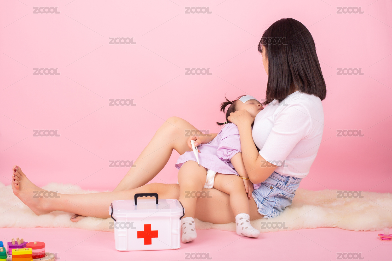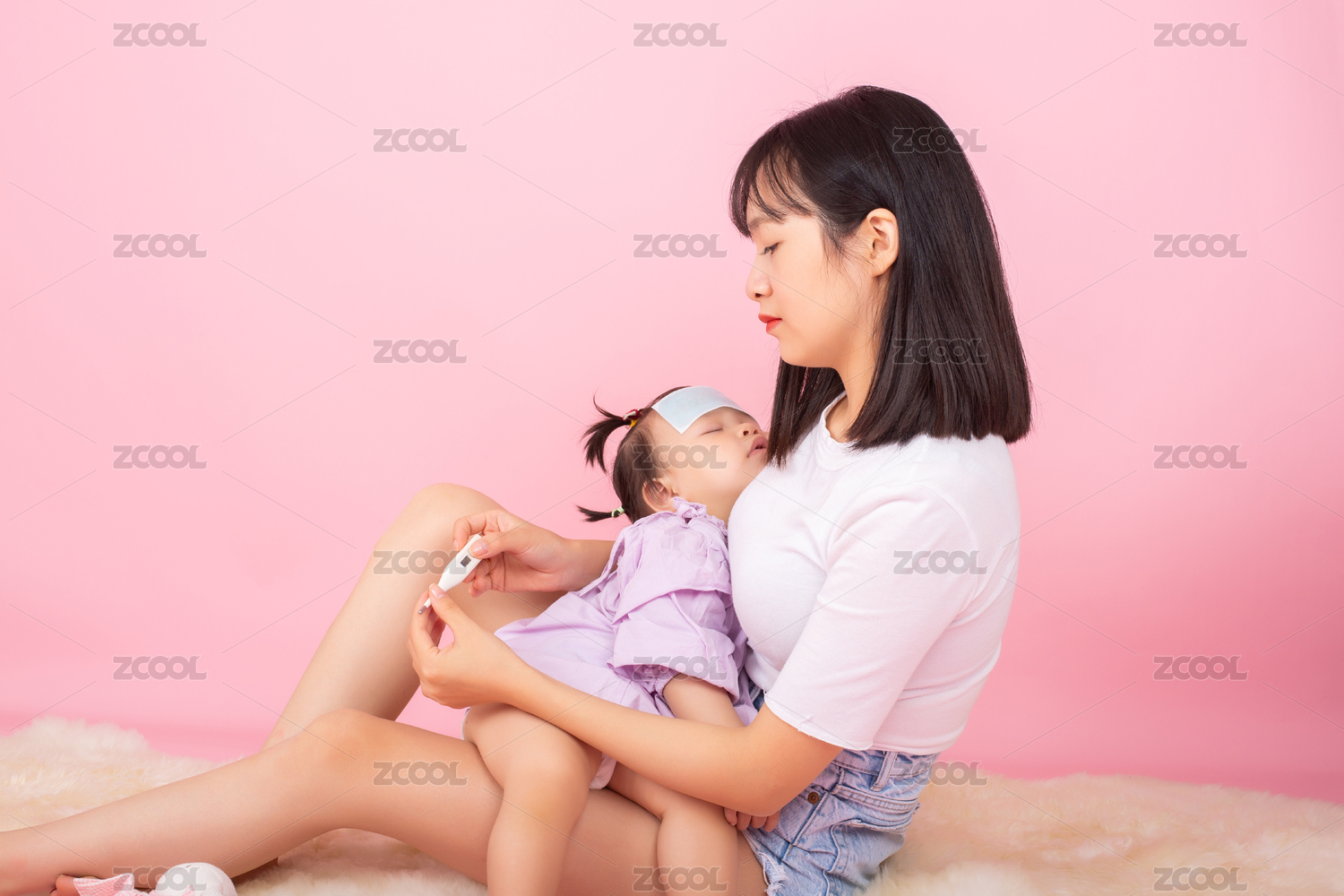 年輕媽媽和他正在發(fā)燒的寶寶