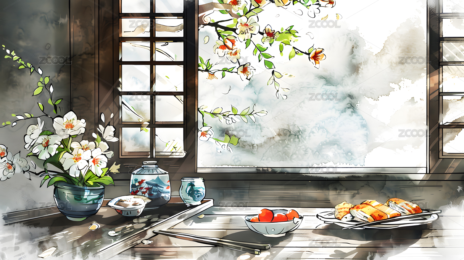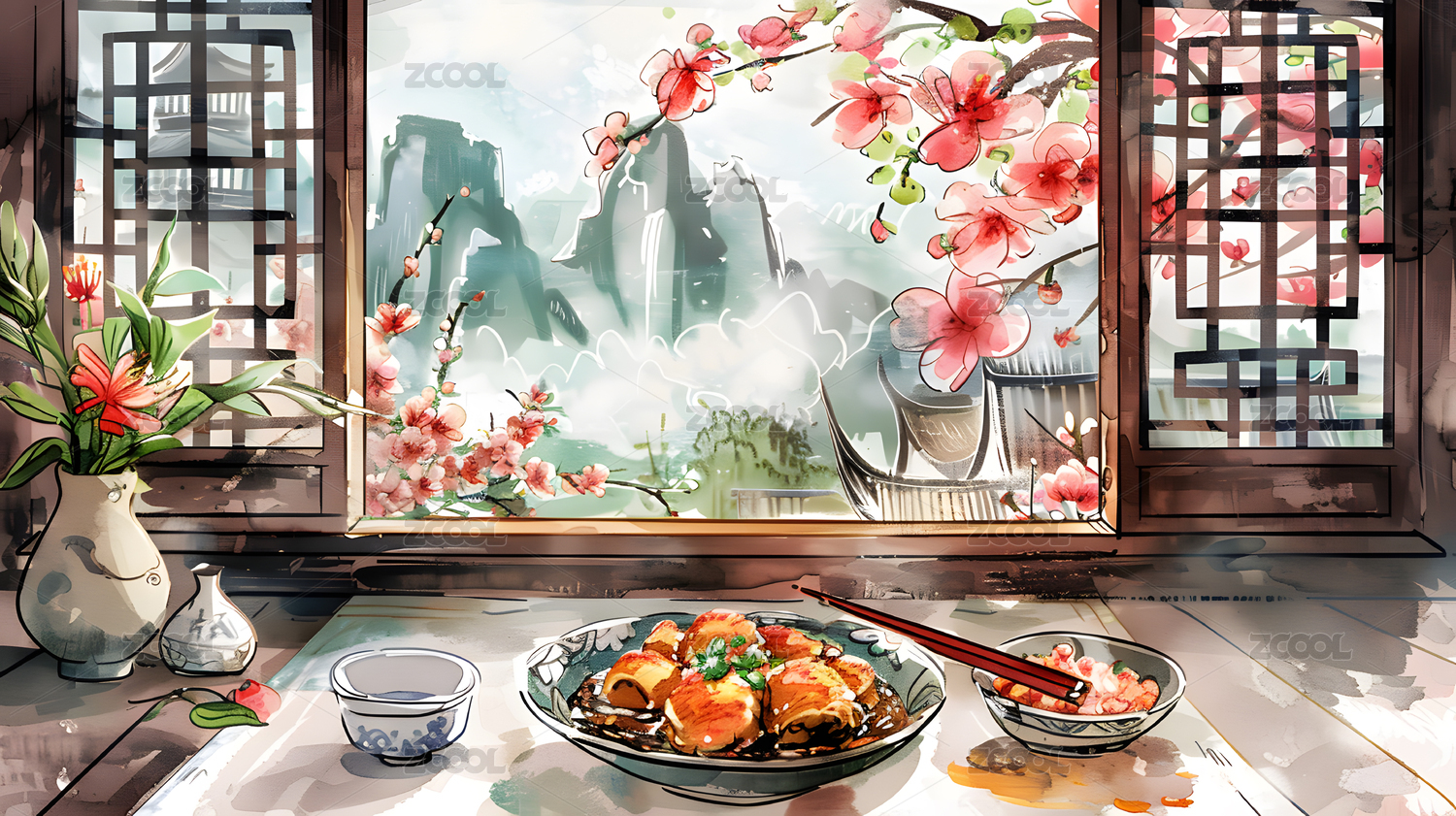 冬至紅梅花母親小孩包餃子桌子節(jié)氣國(guó)風(fēng)插畫