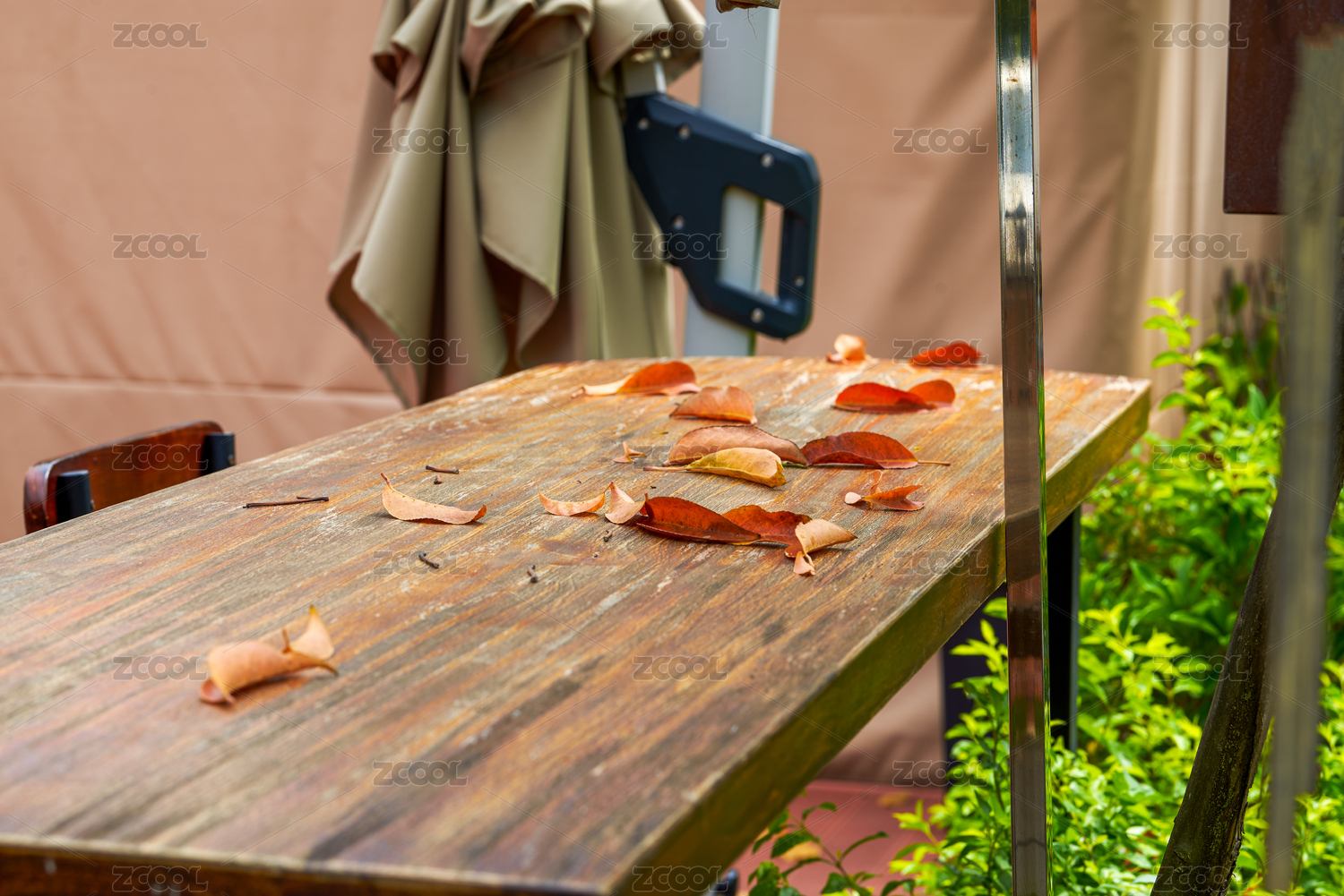 戶外花園里飄滿落葉的木桌子