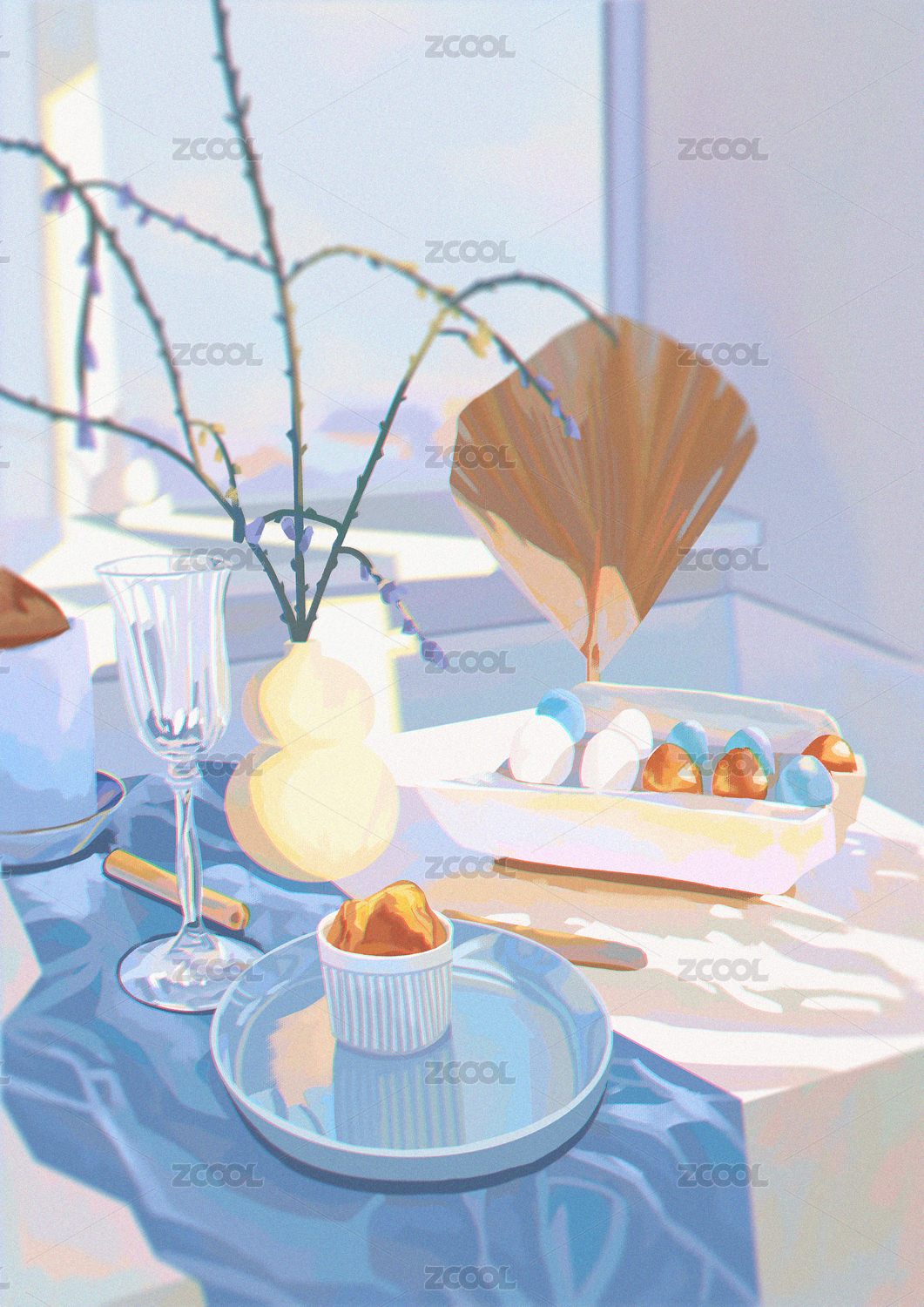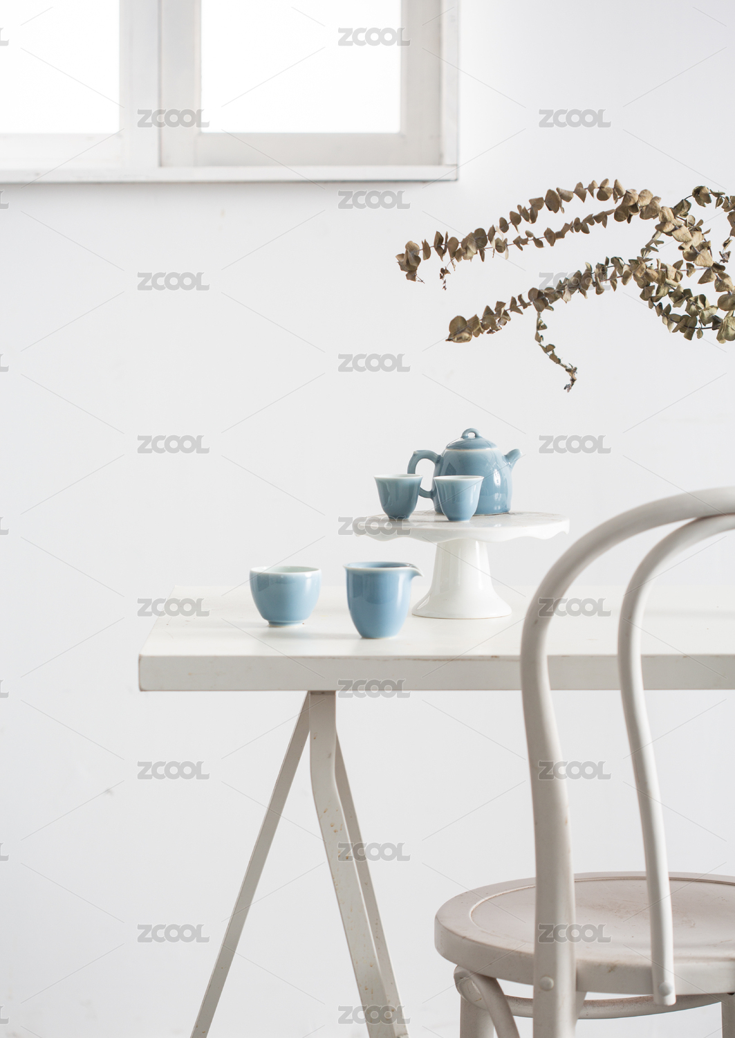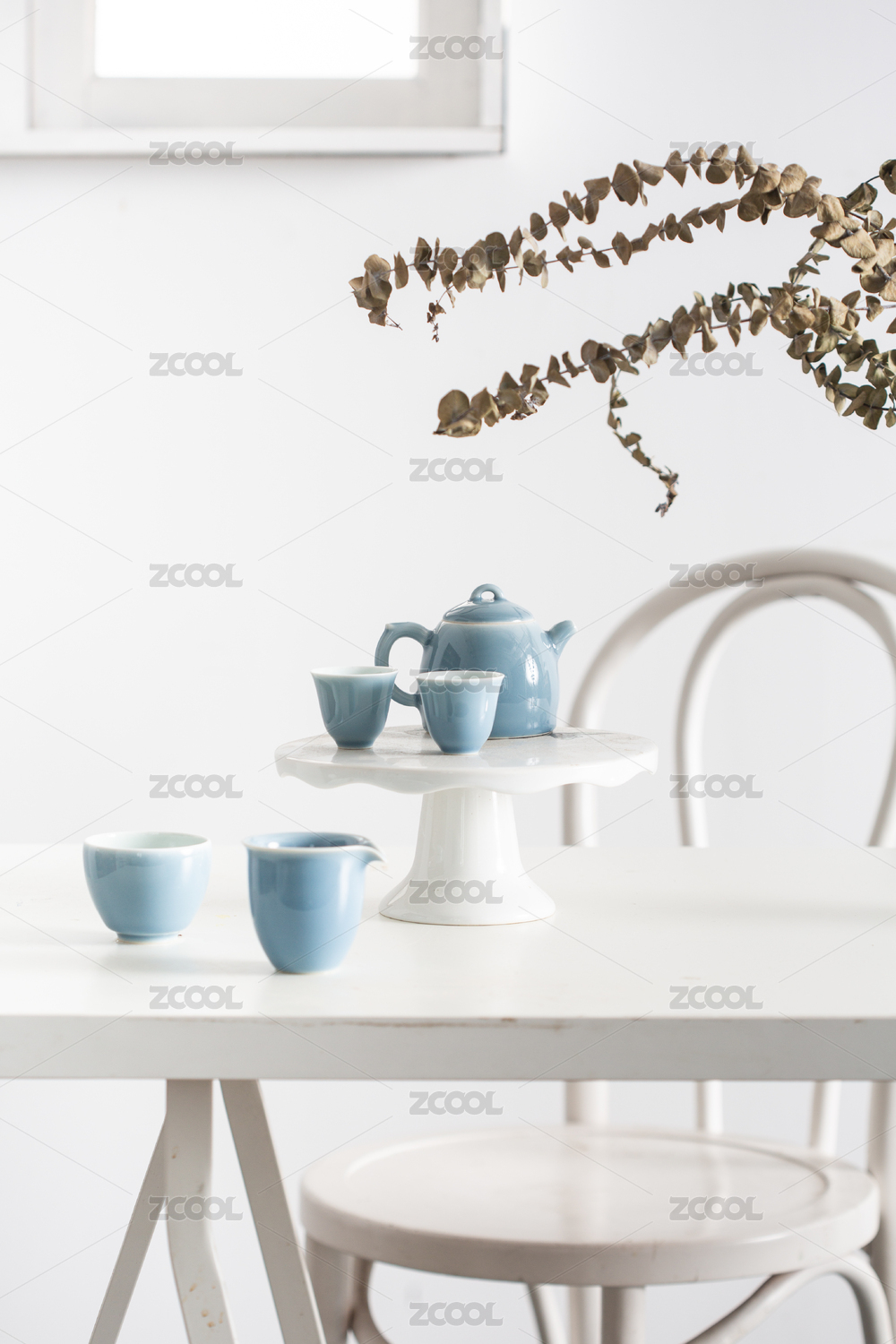 白色桌子上青色釉面陶瓷茶具幾支尤加利葉