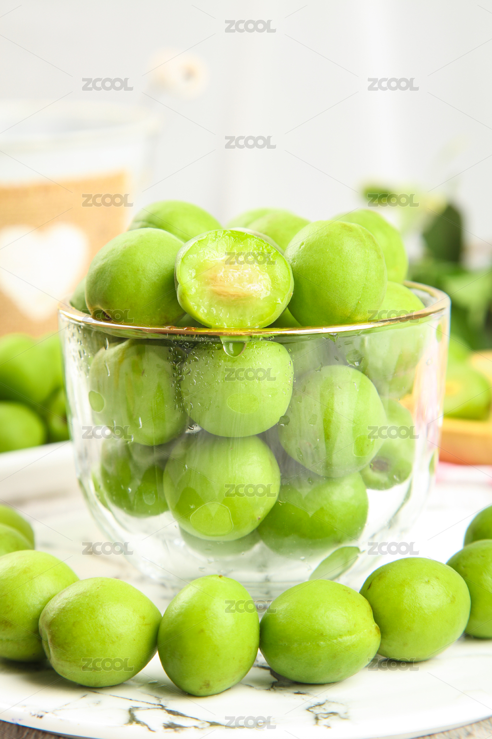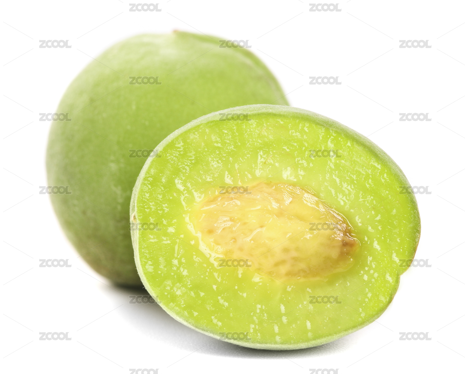 白底上放著一個(gè)完整青梅和半邊青竹梅