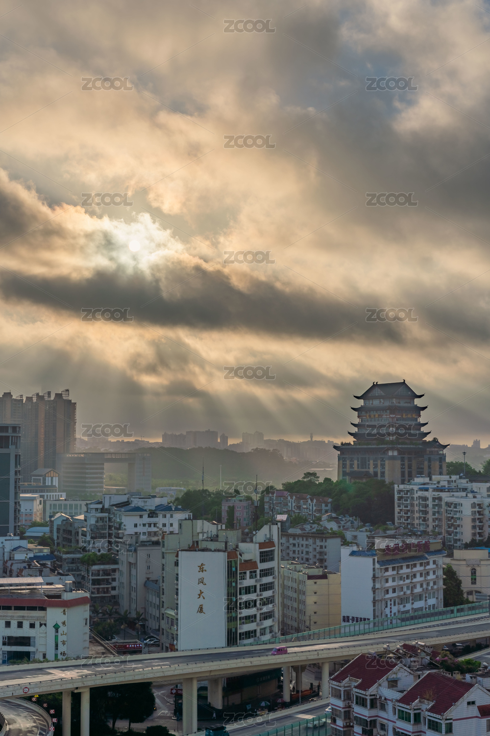 廣西南寧城市天際線,傍晚的青竹立交與邕州閣