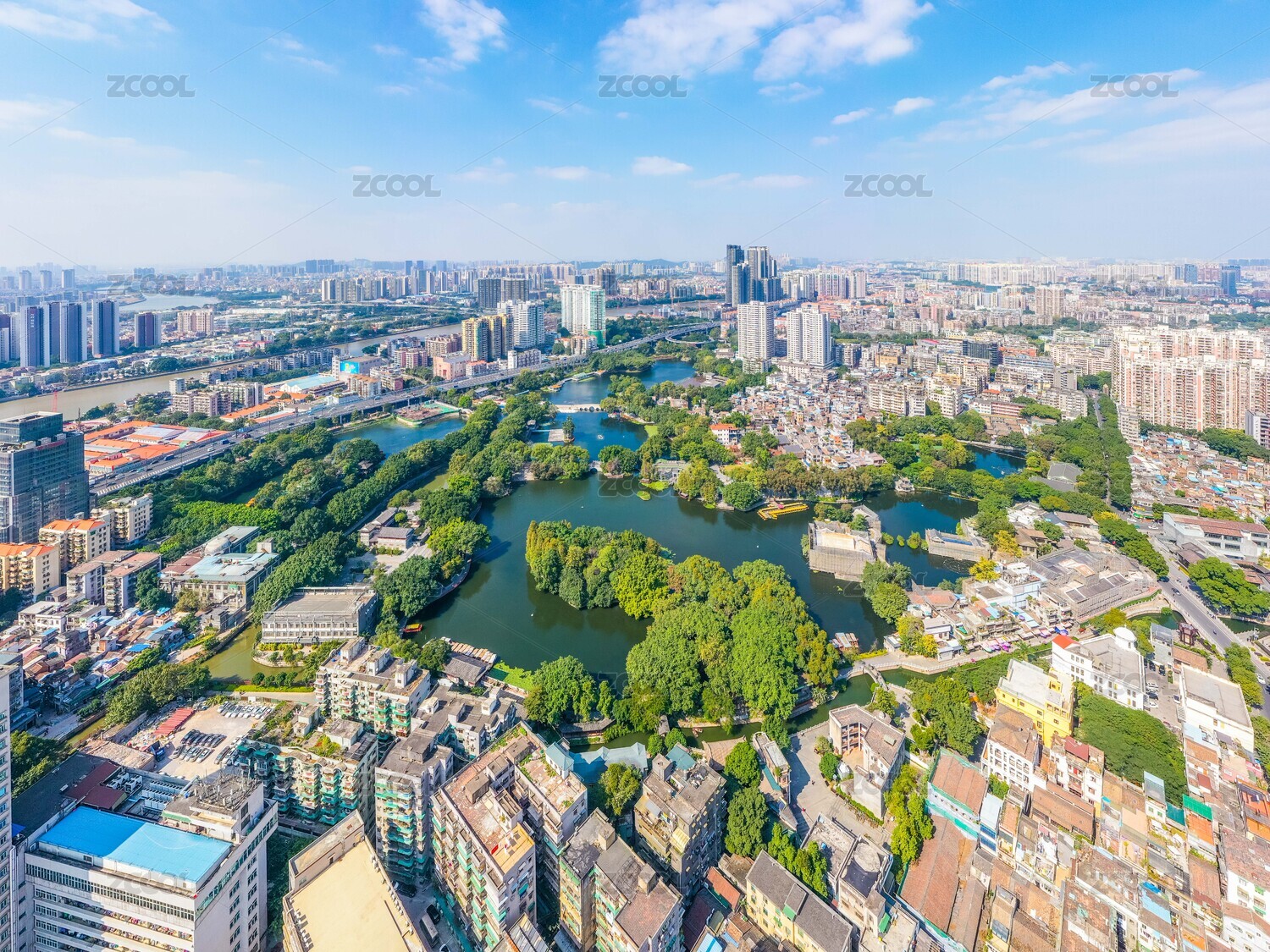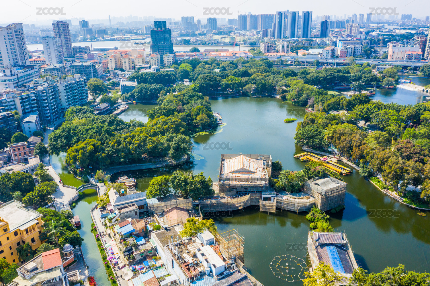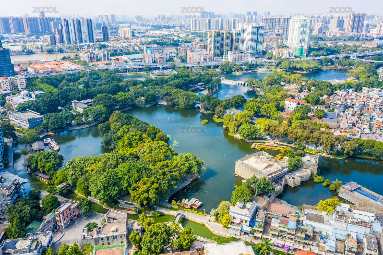 航拍中國廣東廣州荔灣區(qū)泮塘地區(qū)荔灣湖公園