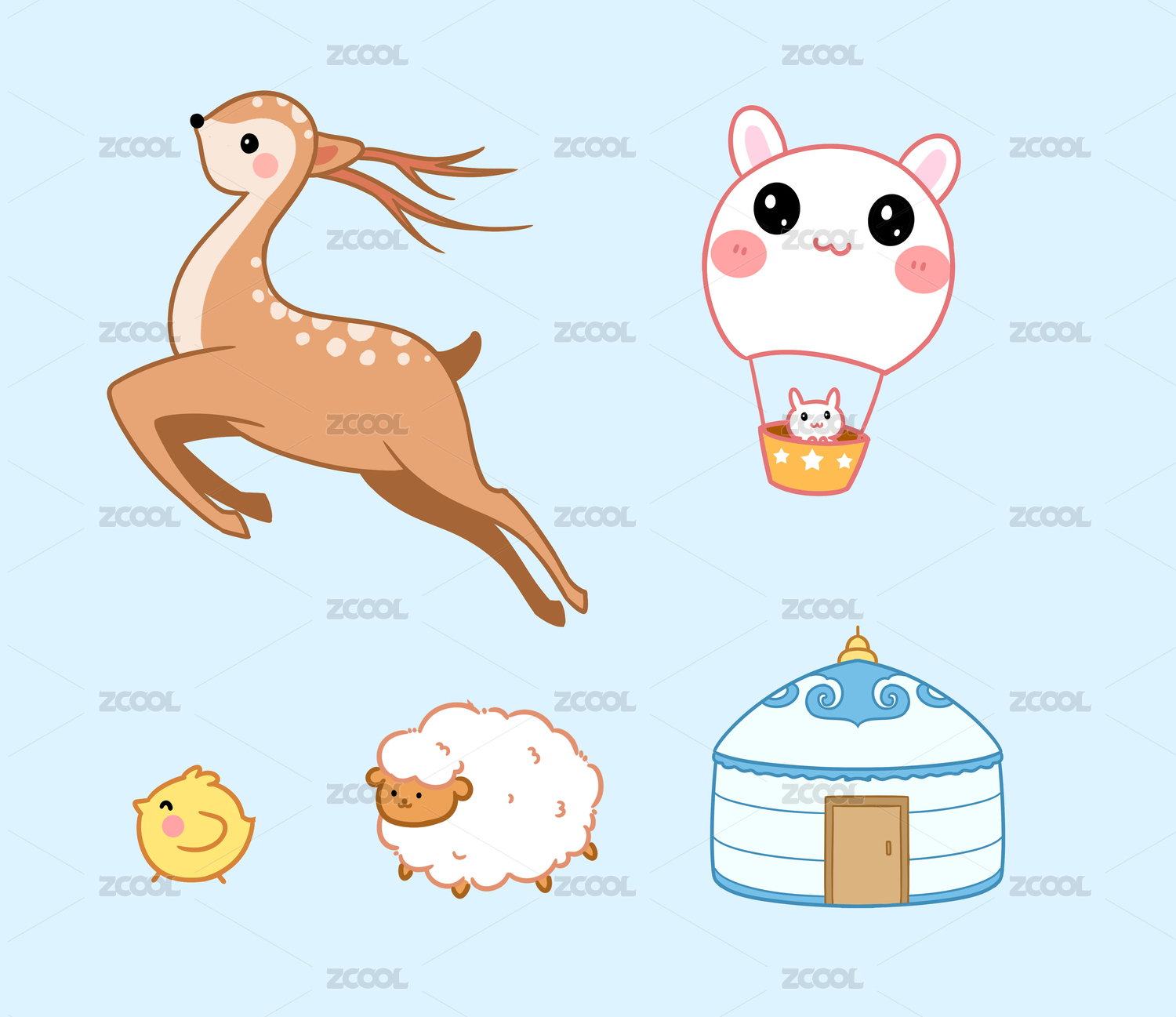 Q版兒童插畫鹿 羊 小雞 蒙古包 氫氣球