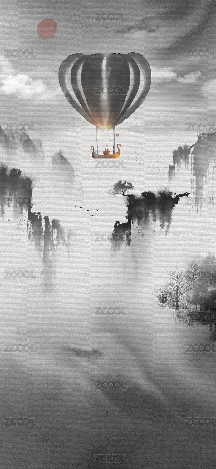 中國風(fēng)意境黑白抽象寫意山水風(fēng)景畫-氫氣球