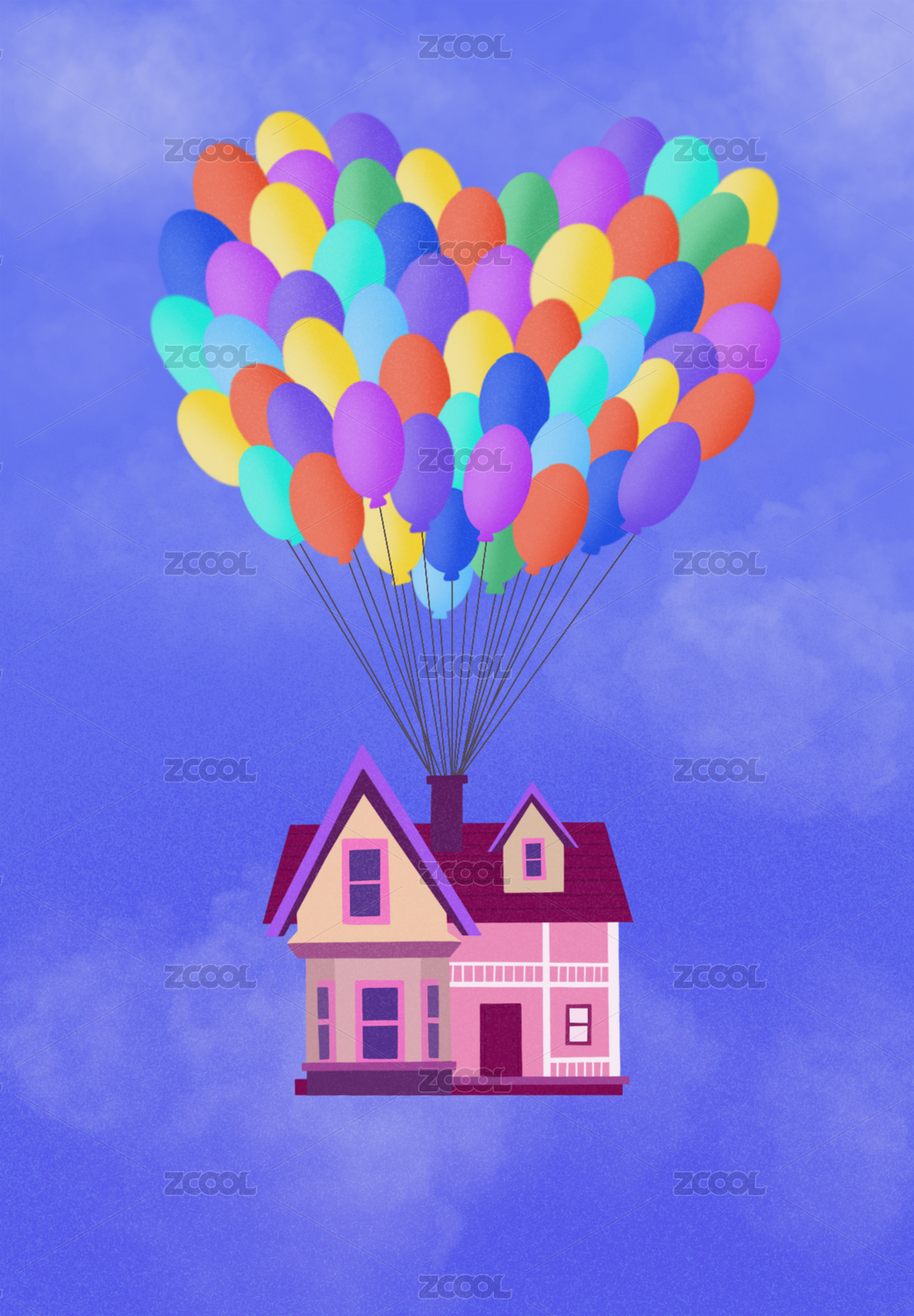 氣球帶著房子飄在天上插畫