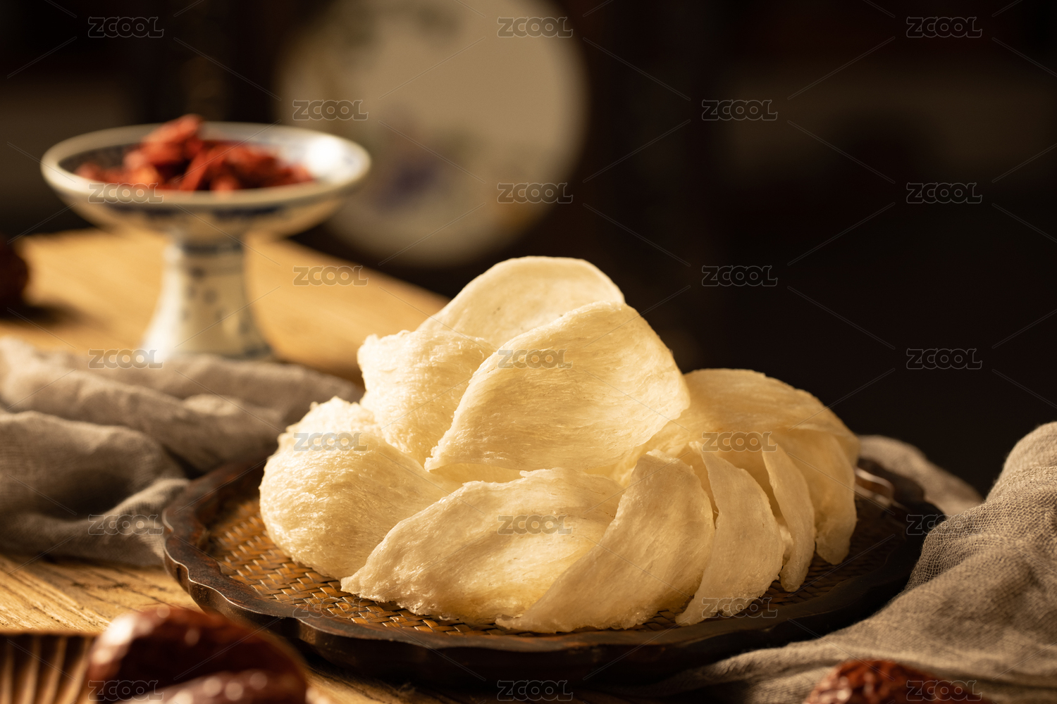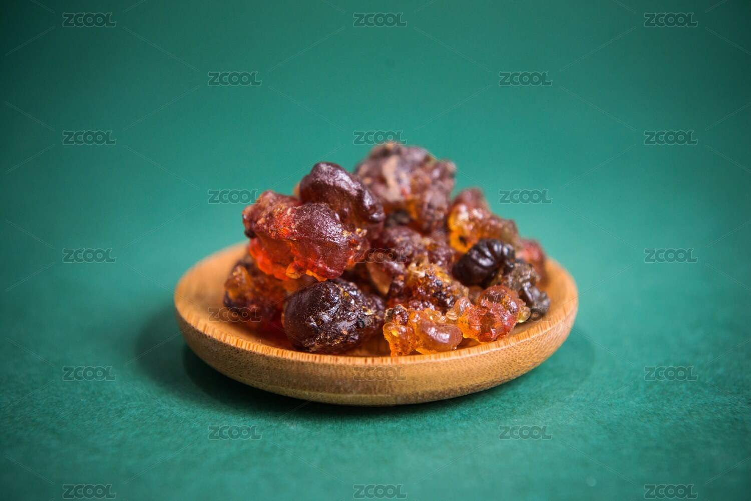 綠色背景木碗里的桃膠