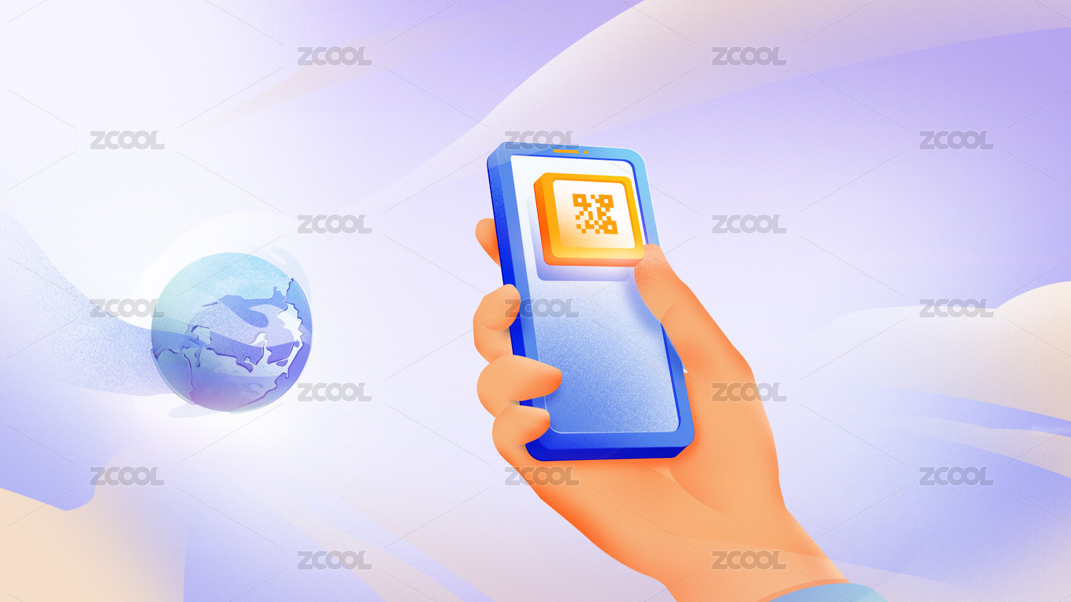 手拿手機(jī)掃碼地球-扁平肌理感插畫