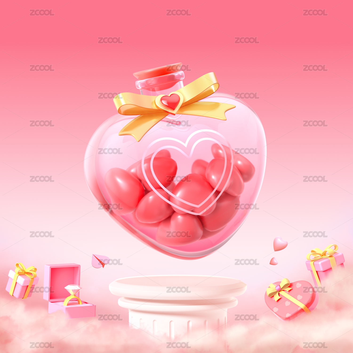 情人節(jié)粉紅色云端愛心玻璃瓶頭圖3D場(chǎng)景