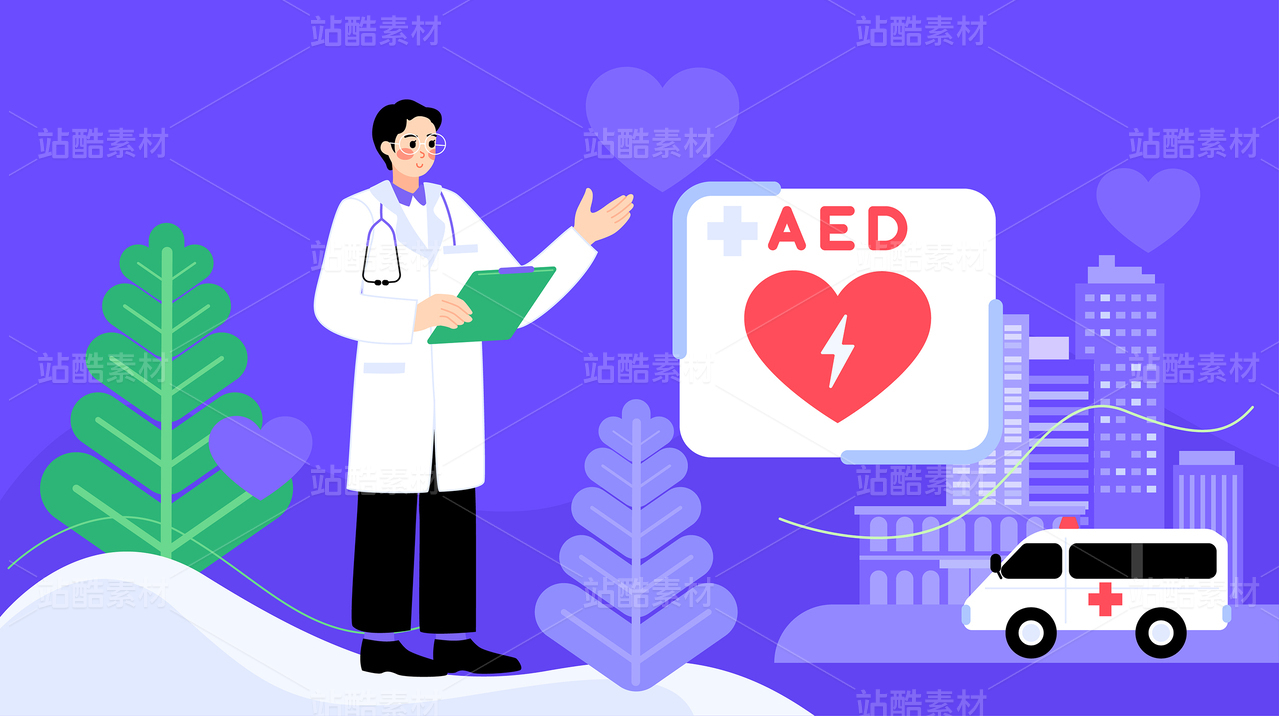 個男醫(yī)生AED除顫儀心救護車建筑樹木矢量插畫