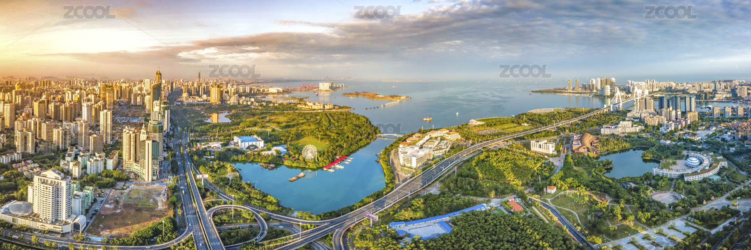 Aerial View of Buildings and Parks in Binhai Central Business District and Parks of Haikou City in Hainan Island of China