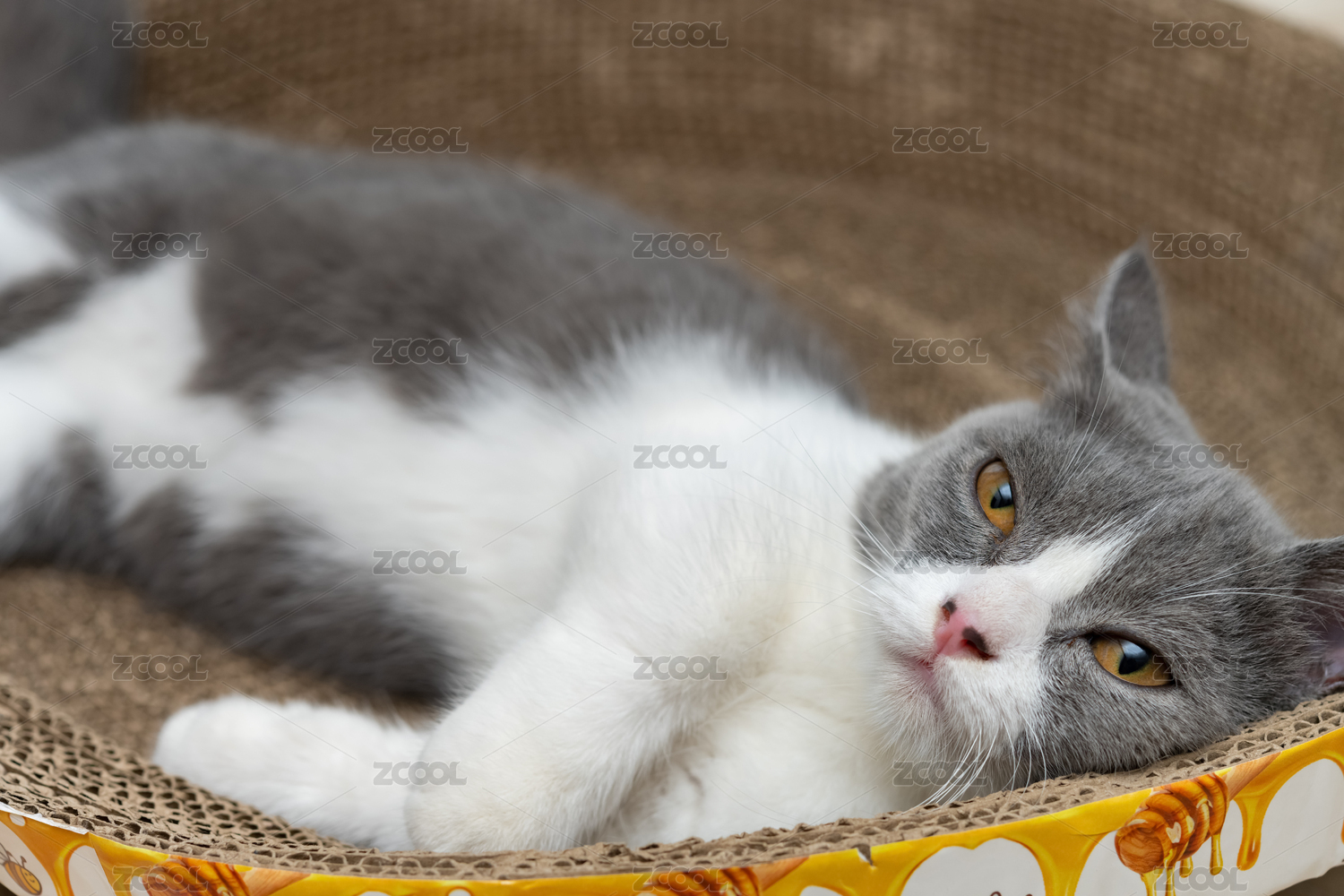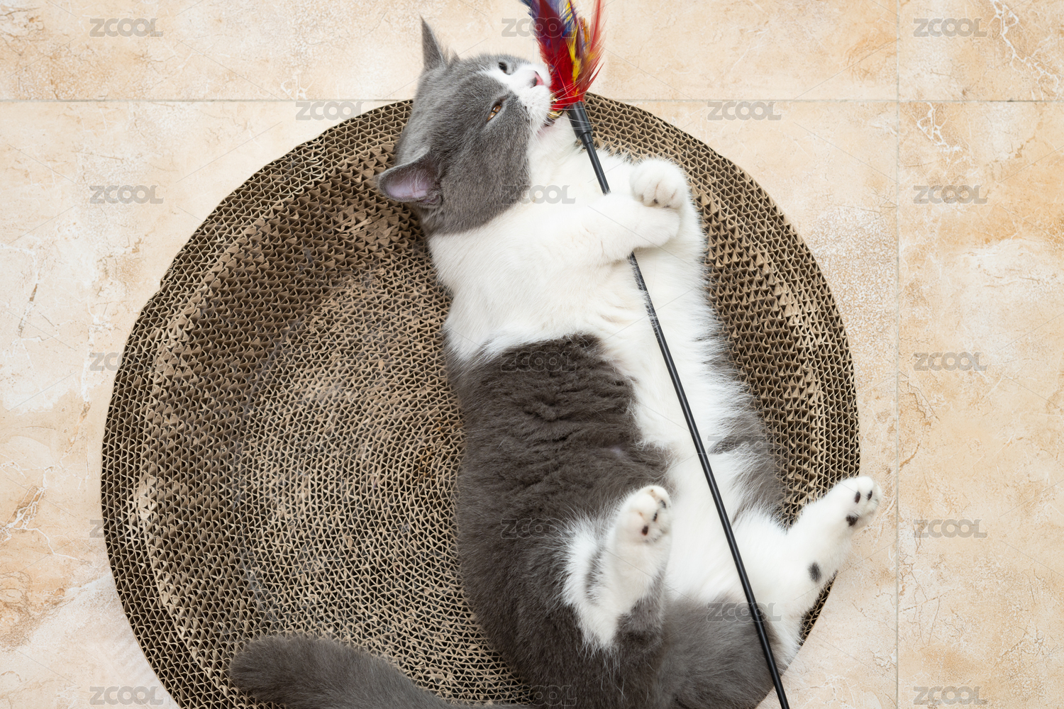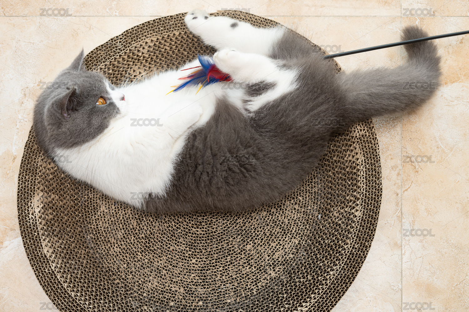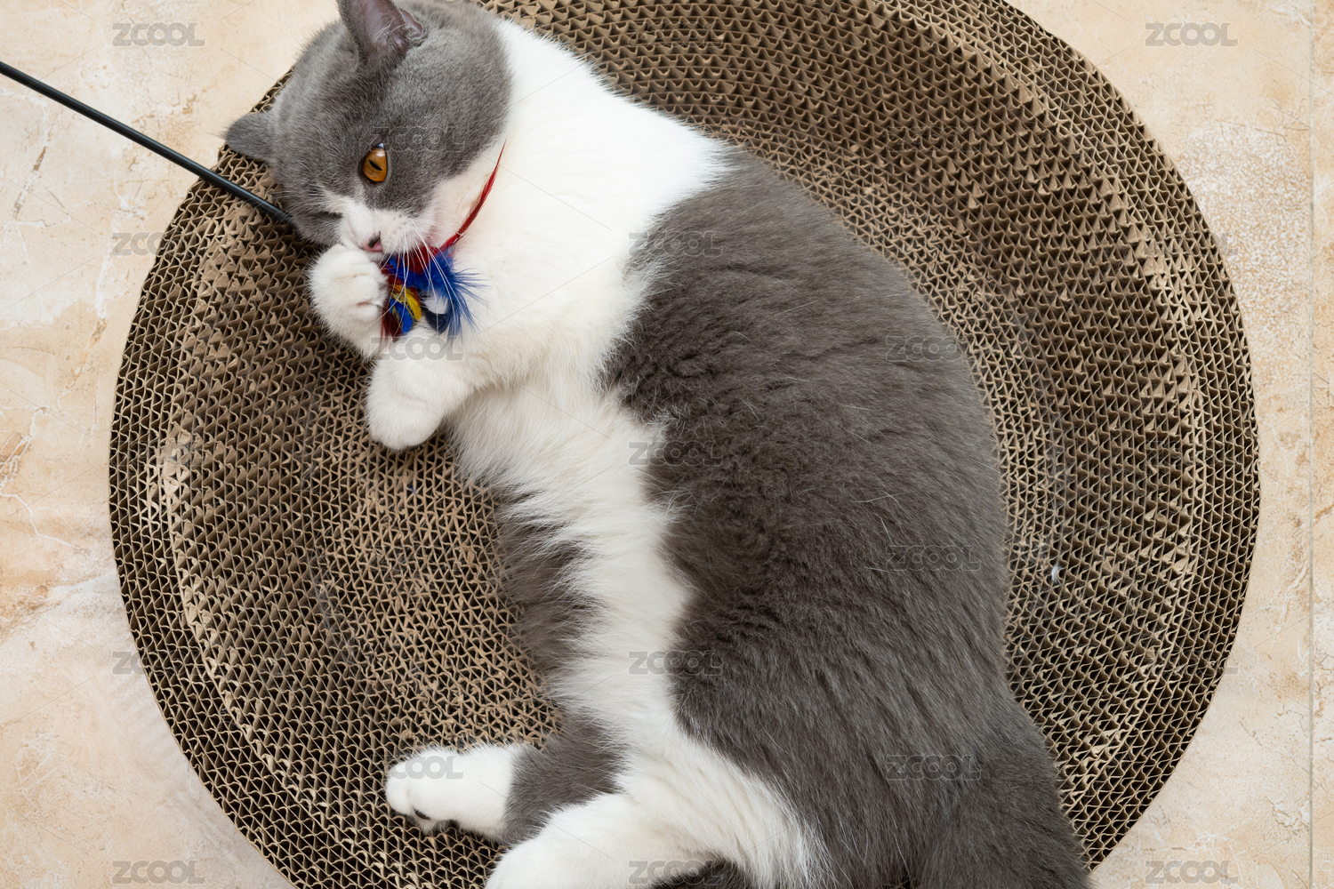 英短藍(lán)白躺在貓爪板上玩耍逗貓棒