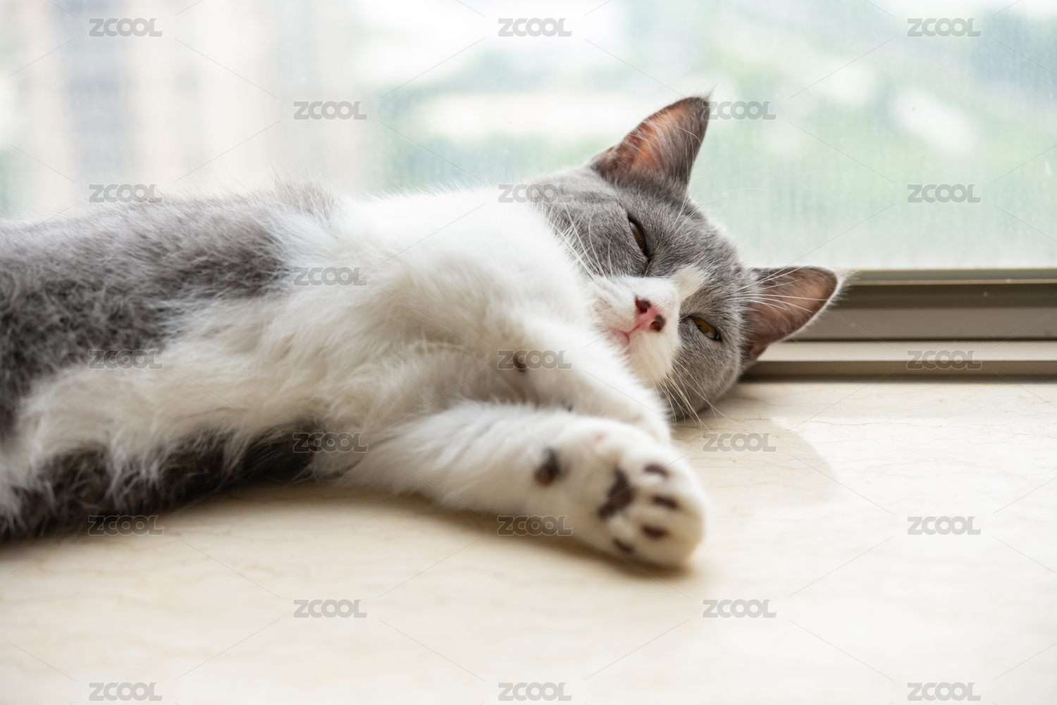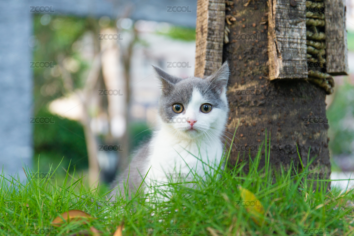 一只可愛(ài)的英短藍(lán)白貓?jiān)诠珗@的草地上趴著
