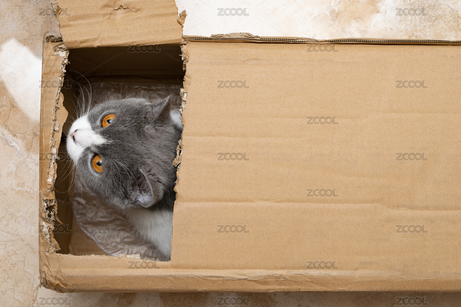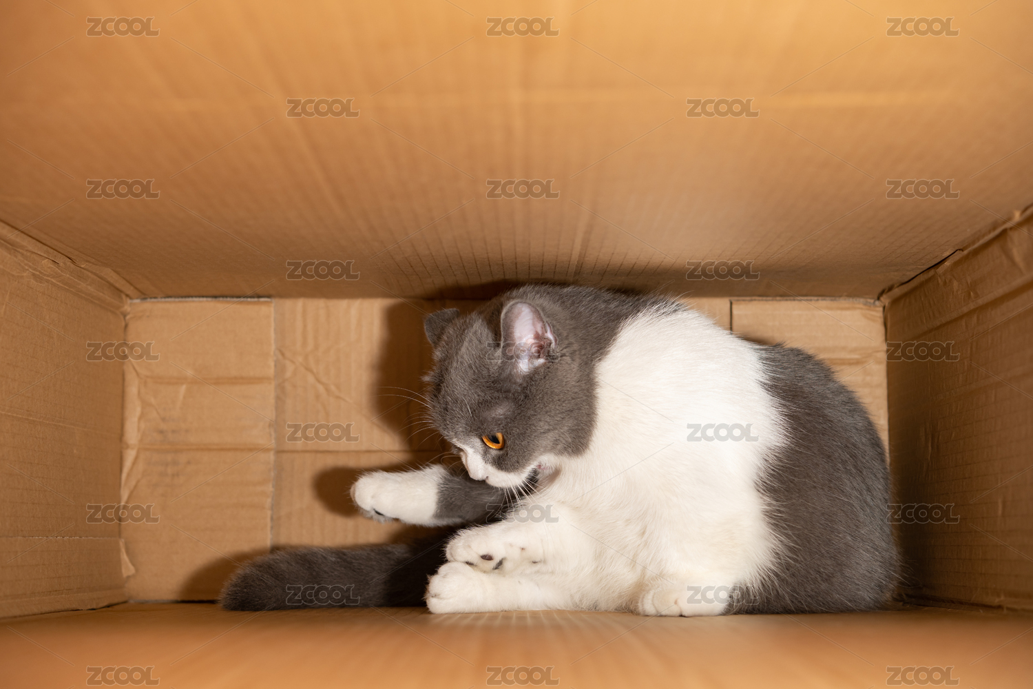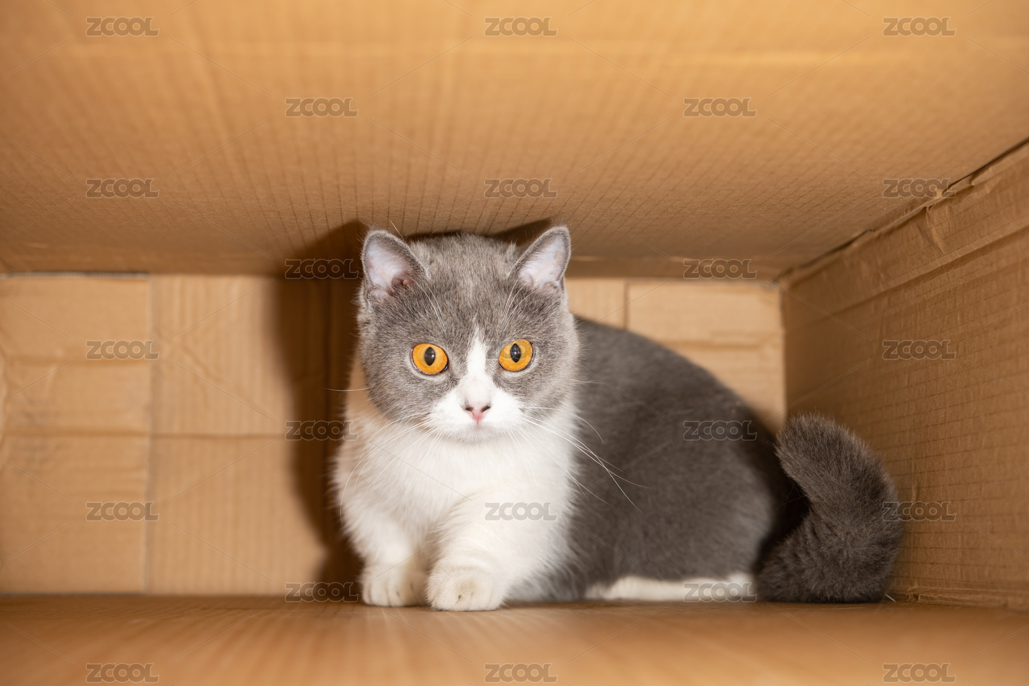 躲在紙箱中的英短藍(lán)白貓貓