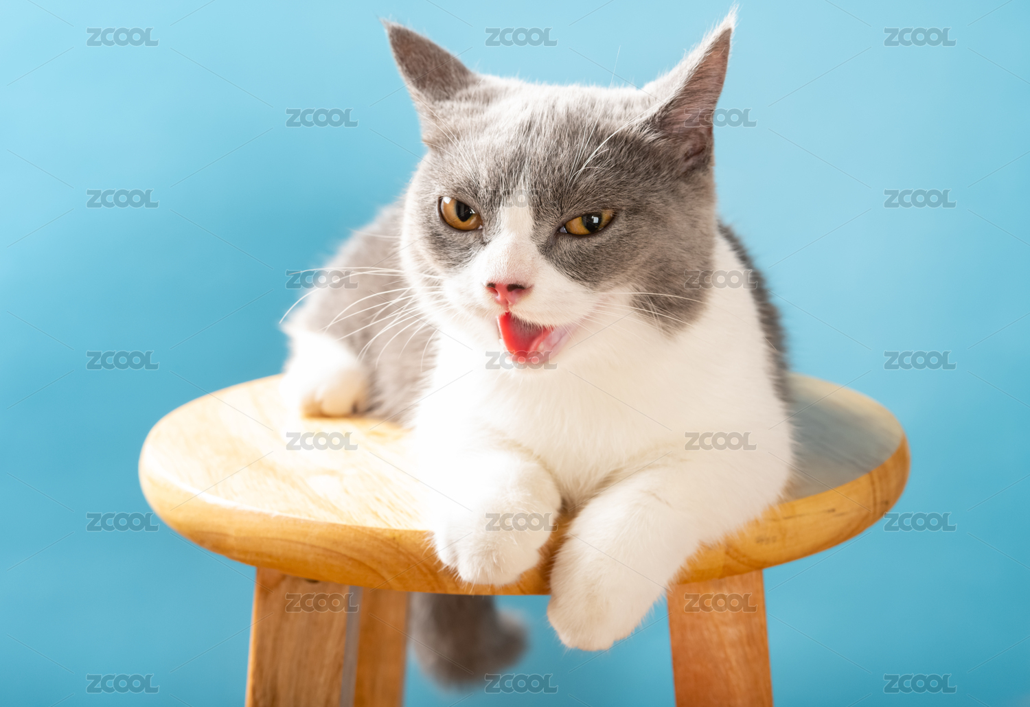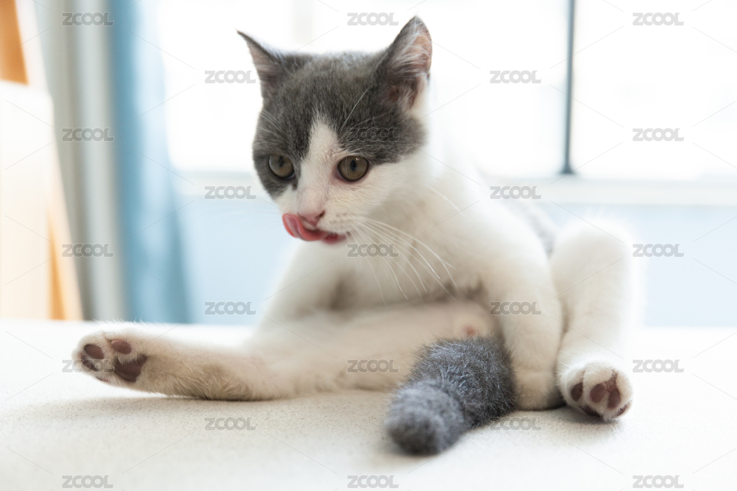 一只可愛(ài)的英短藍(lán)白貓?jiān)谏嘲l(fā)上岔開(kāi)腿舔毛