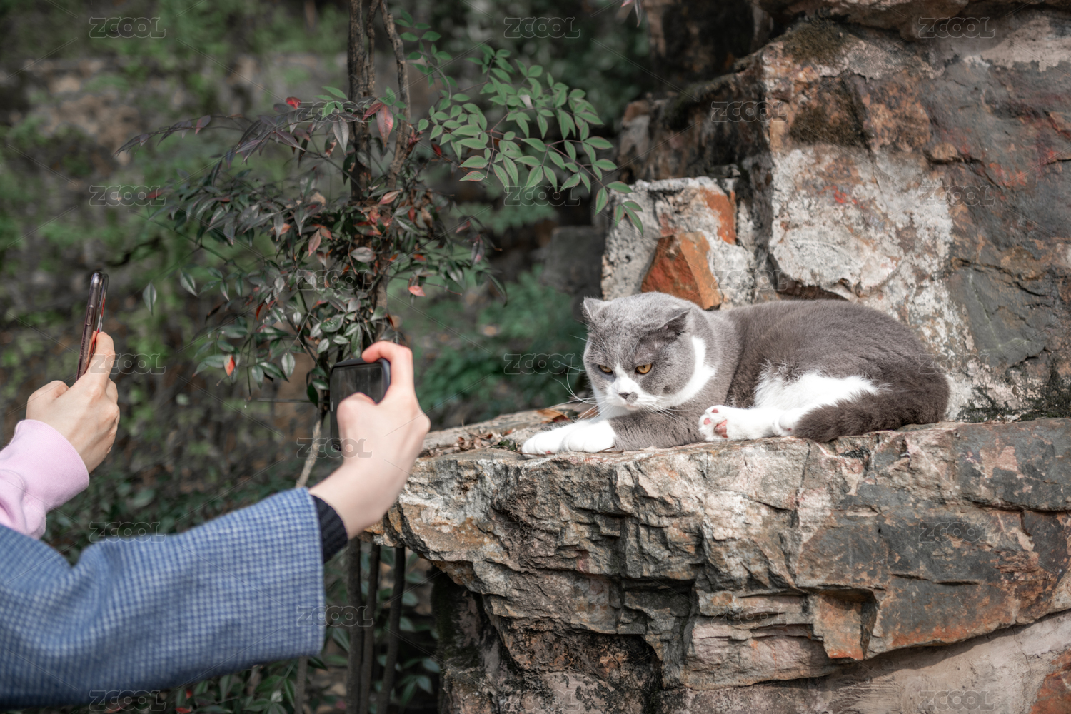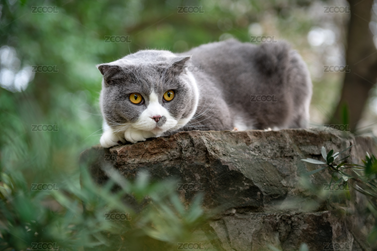 趴在假山上被拍照的英短藍(lán)白貓