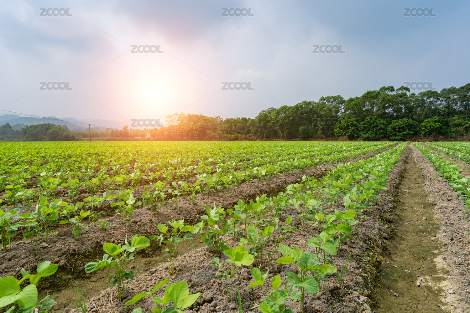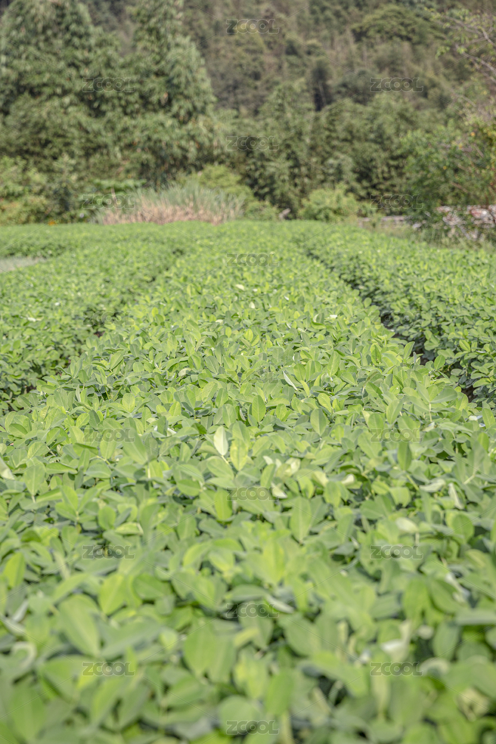小樹林前成片的整齊有序的大豆苗期田塊,中國福建漳州