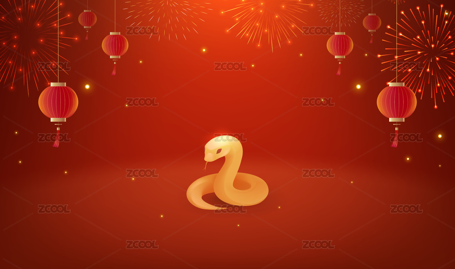 春節(jié)背景設(shè)計金色的蛇在舞臺中央周圍有煙花