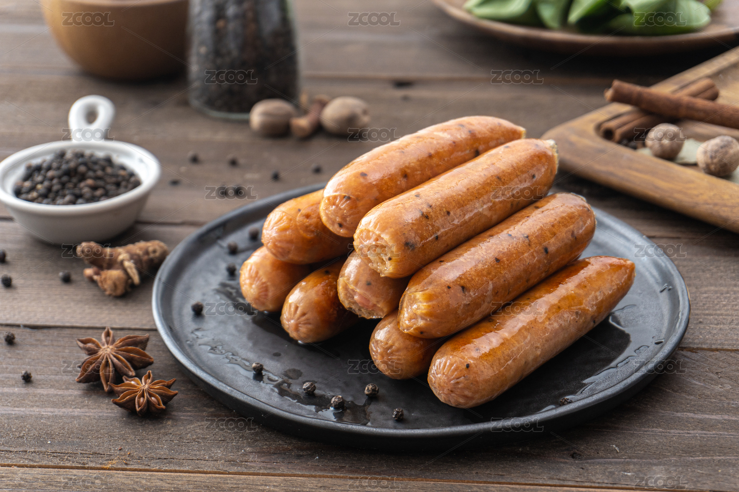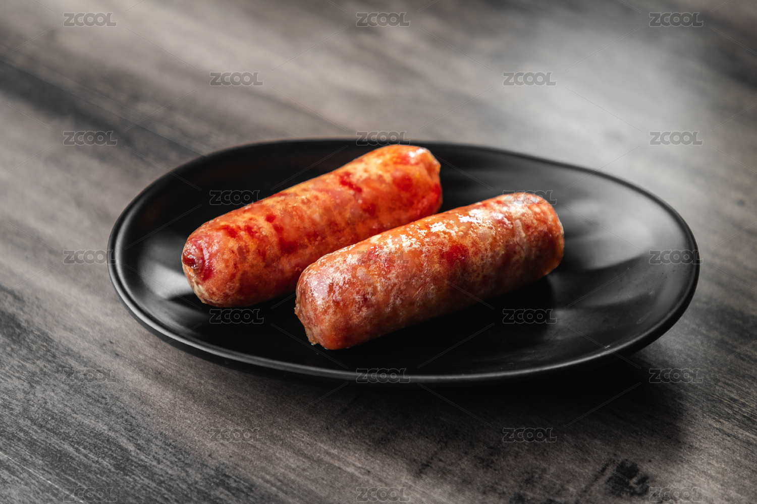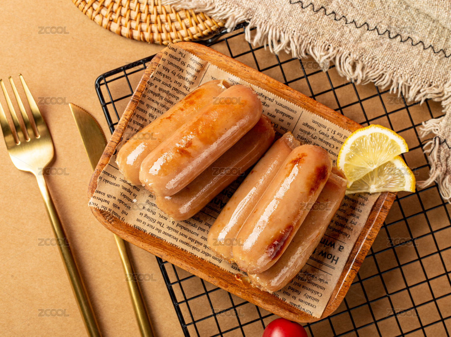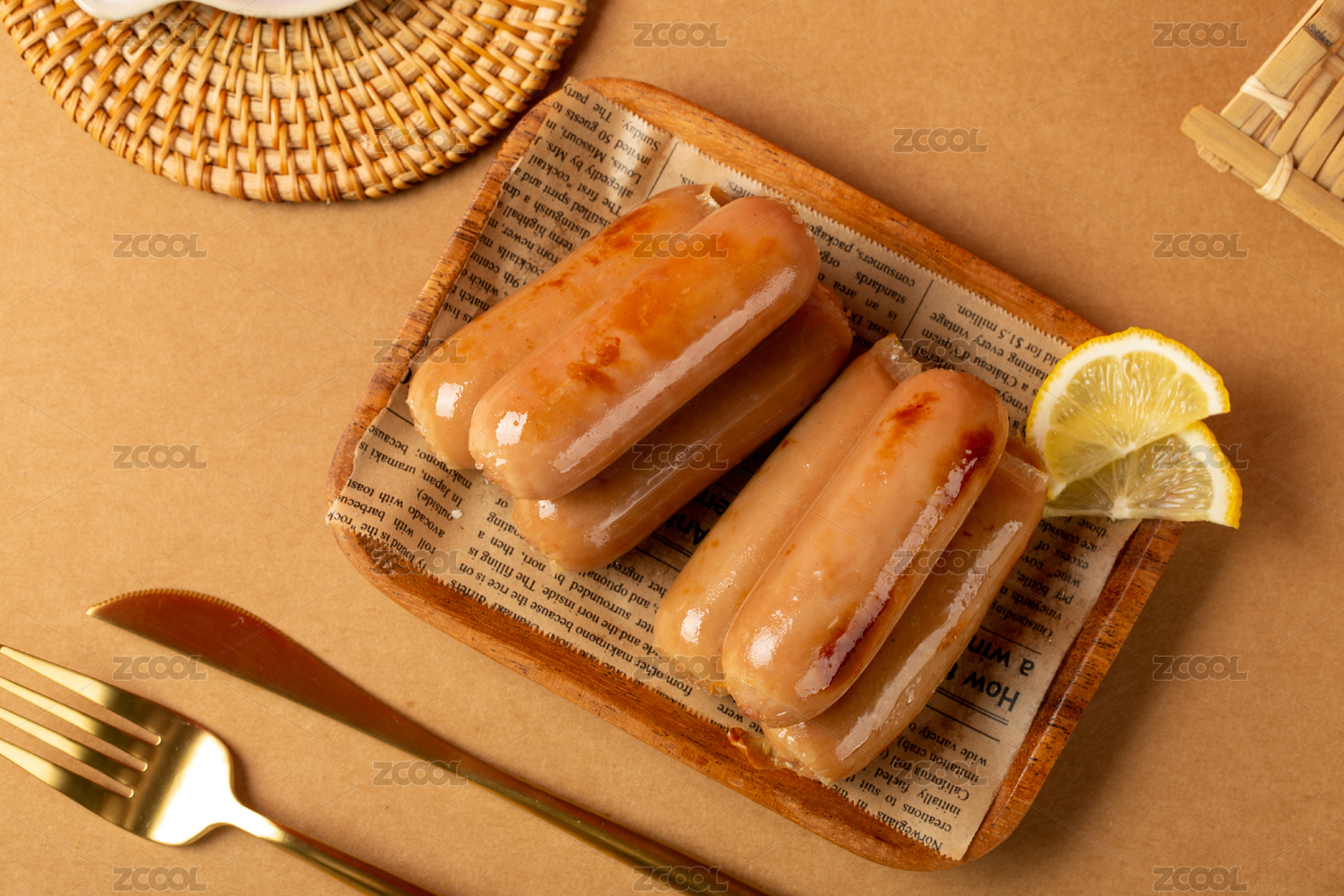 棕色木紋桌面上的盤子里放著兩根烤腸