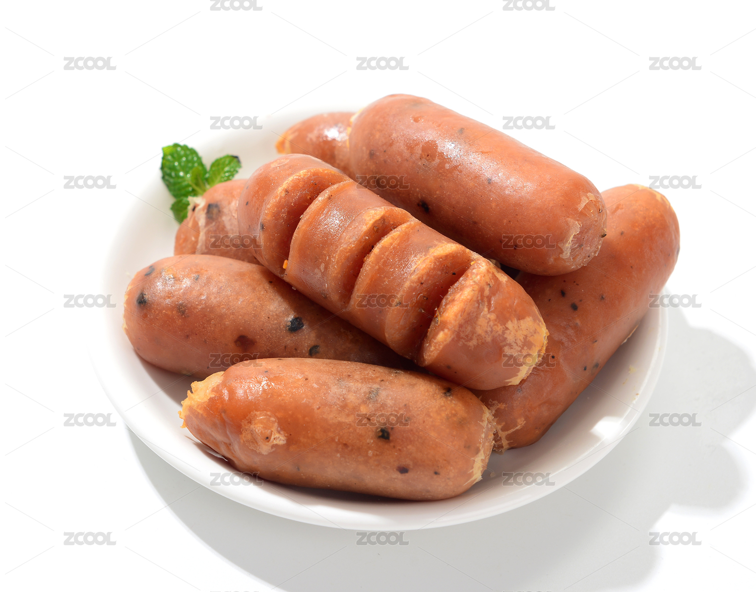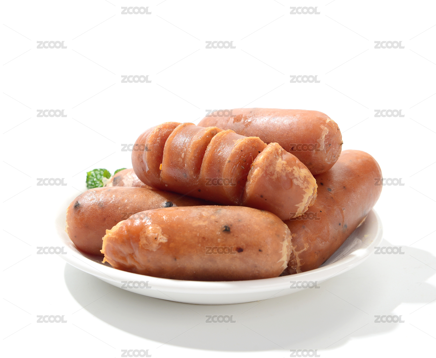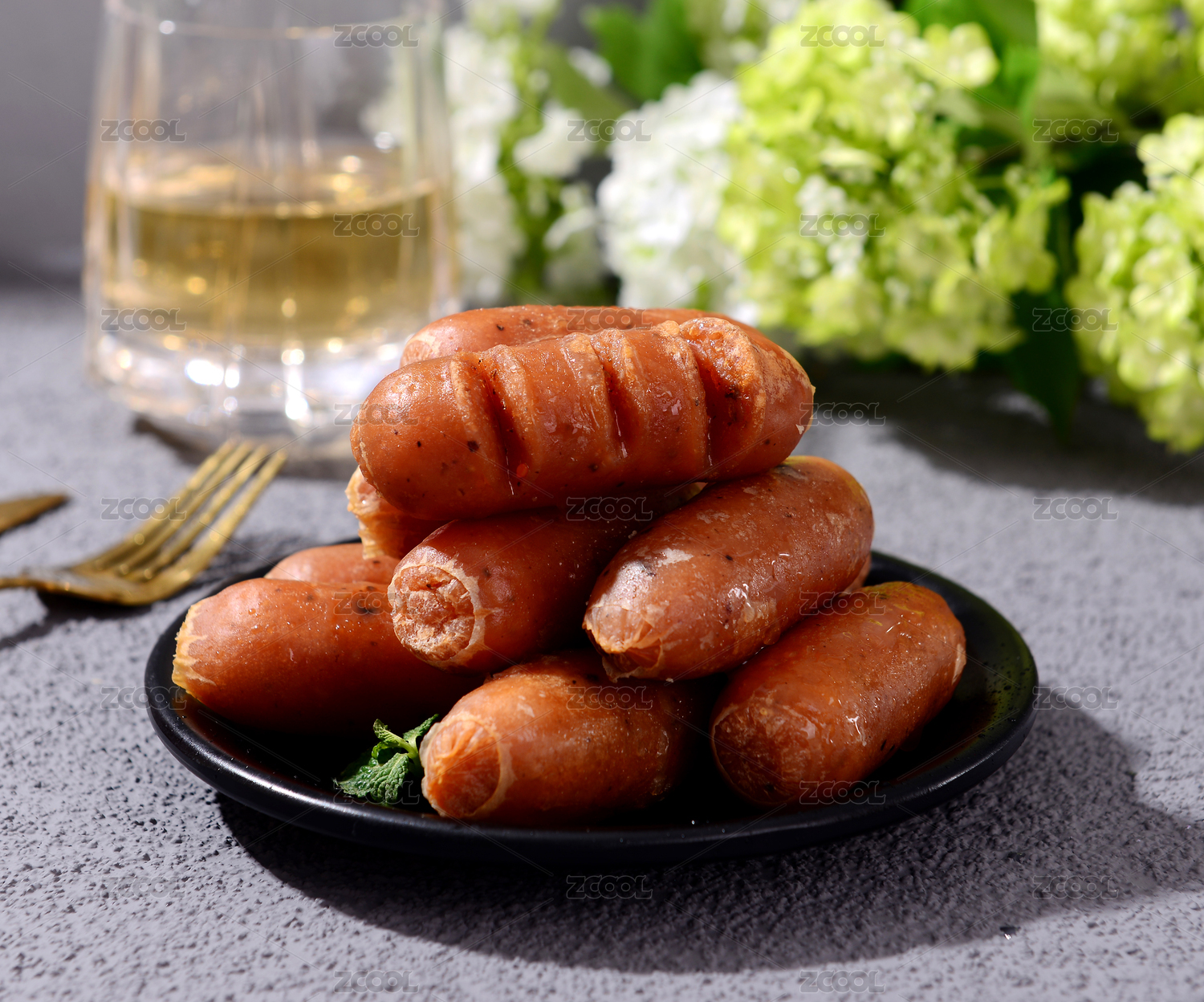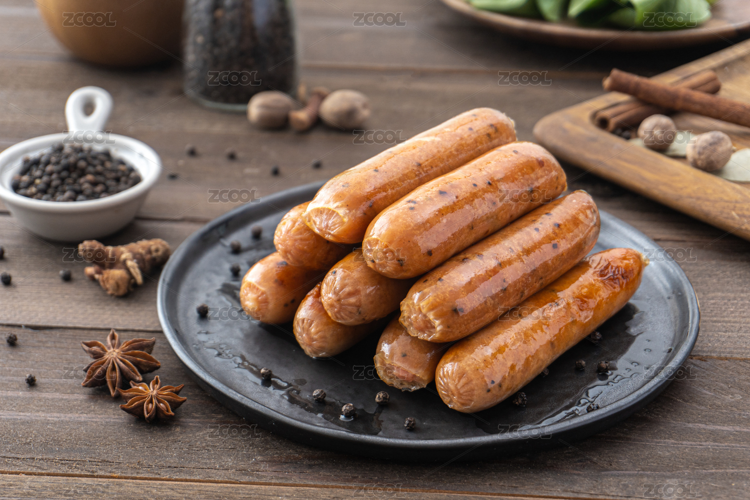 棕色木紋桌面上的盤子里放著兩根烤腸