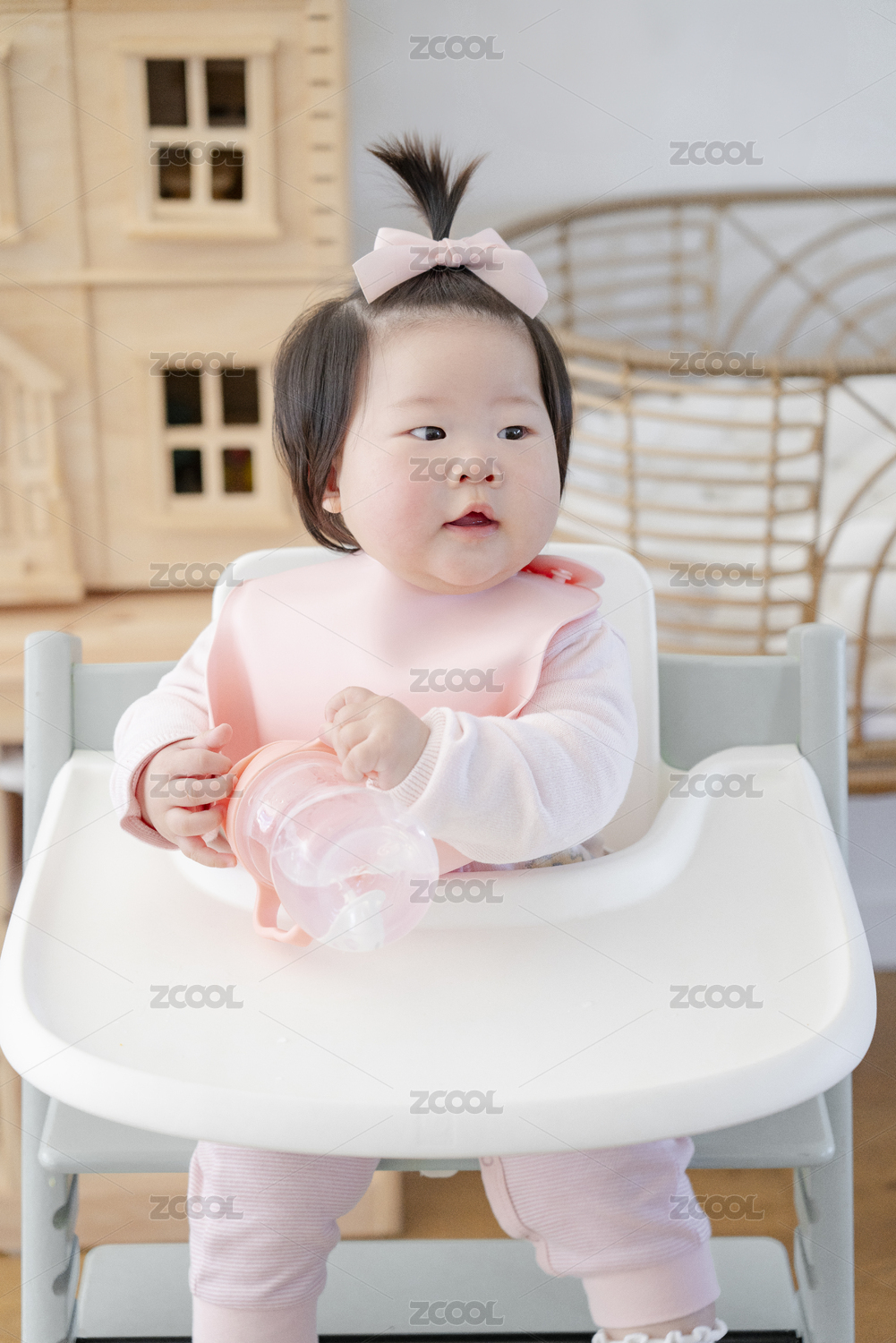 可愛女嬰手拿嬰兒奶瓶坐在寶寶餐桌椅中