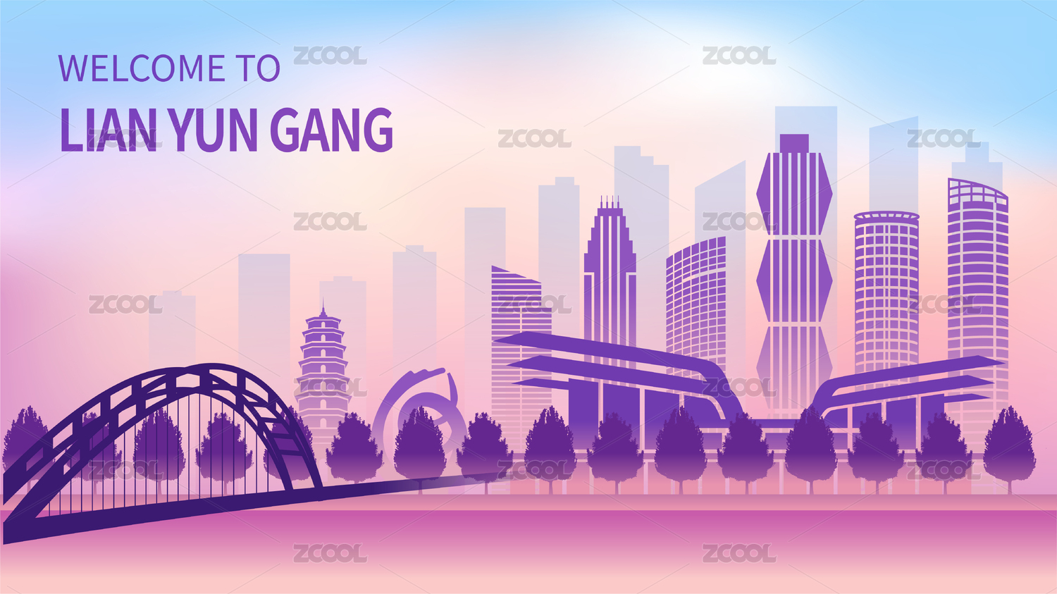 中國江蘇省連云港市城市天際線矢量插畫紫色