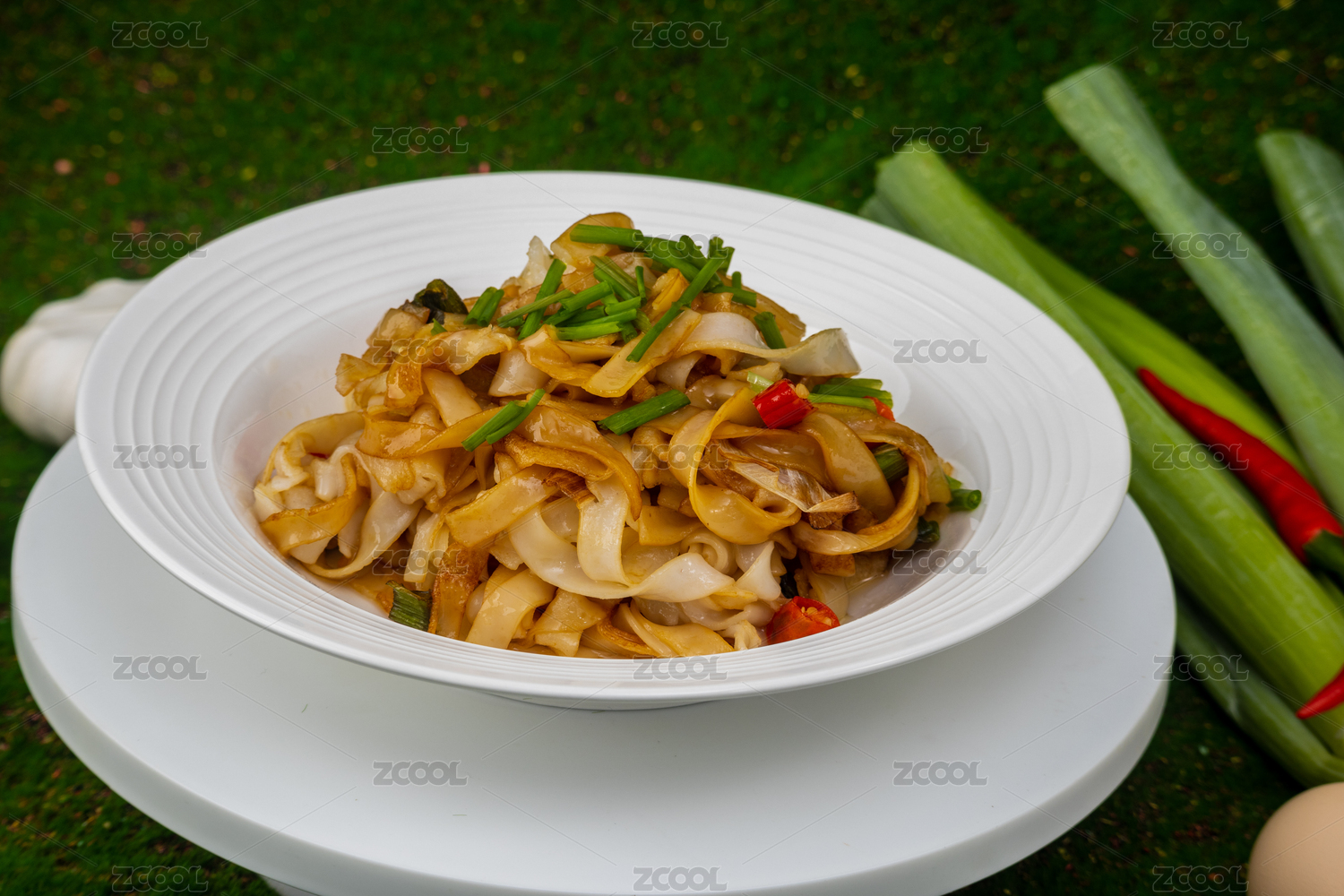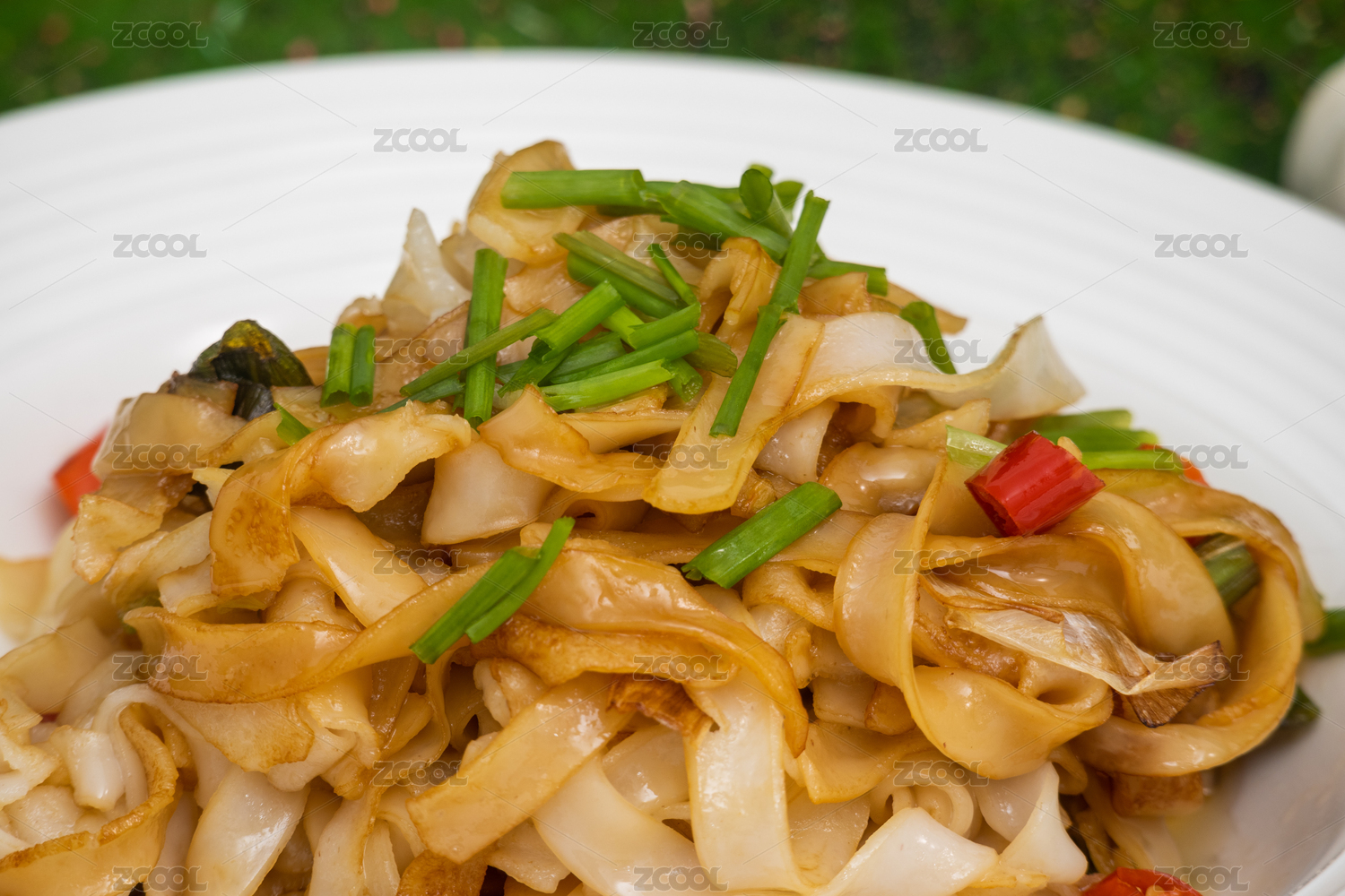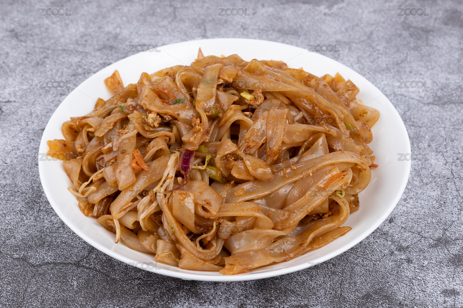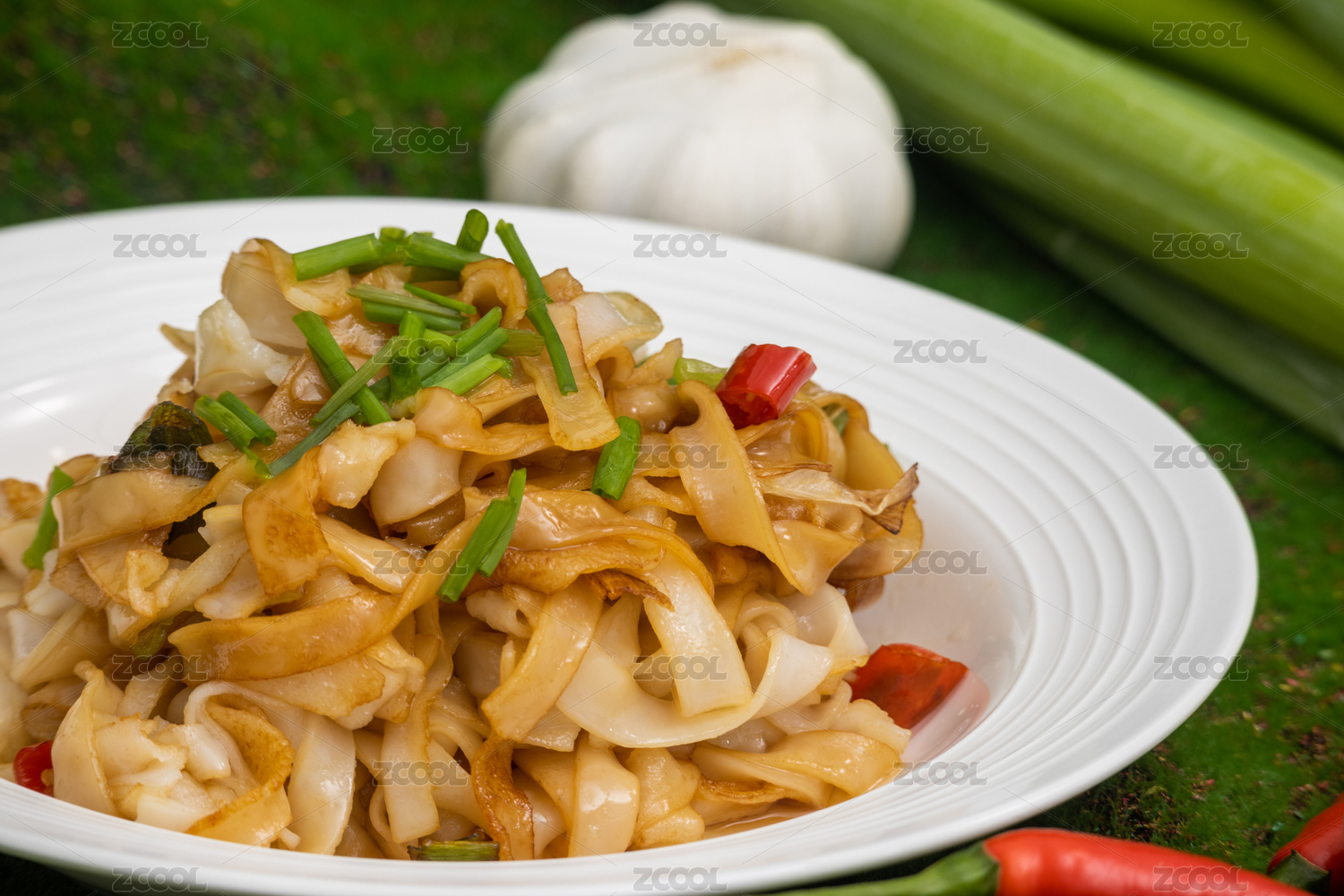 綠色背景白色盤(pán)子里剛烹飪好的粵式炒河粉