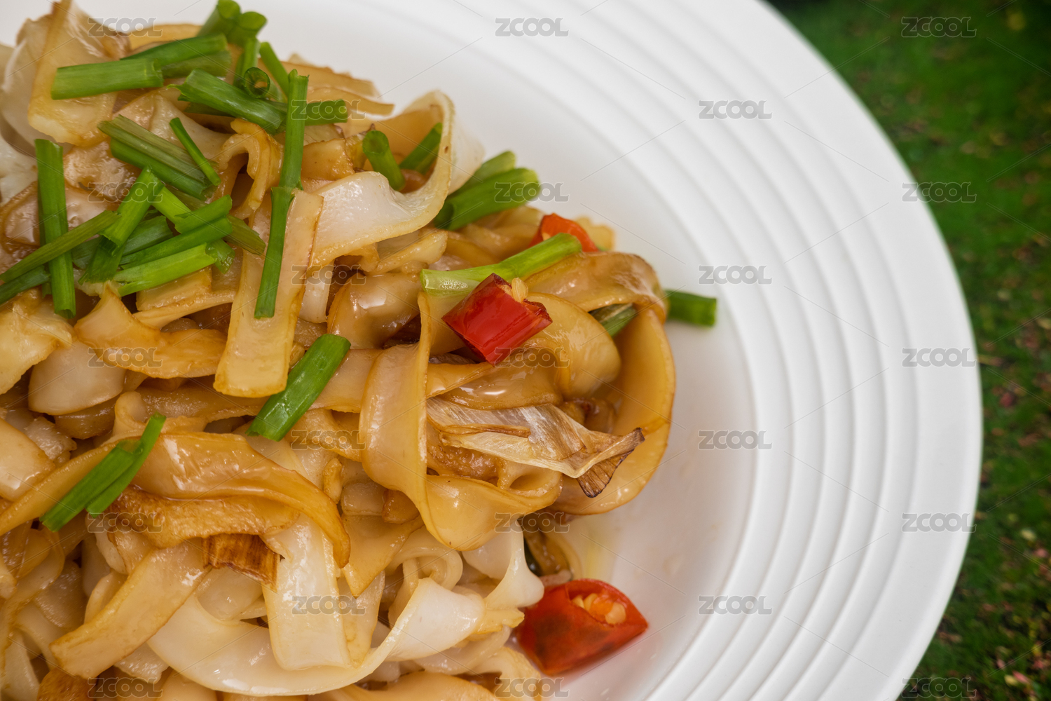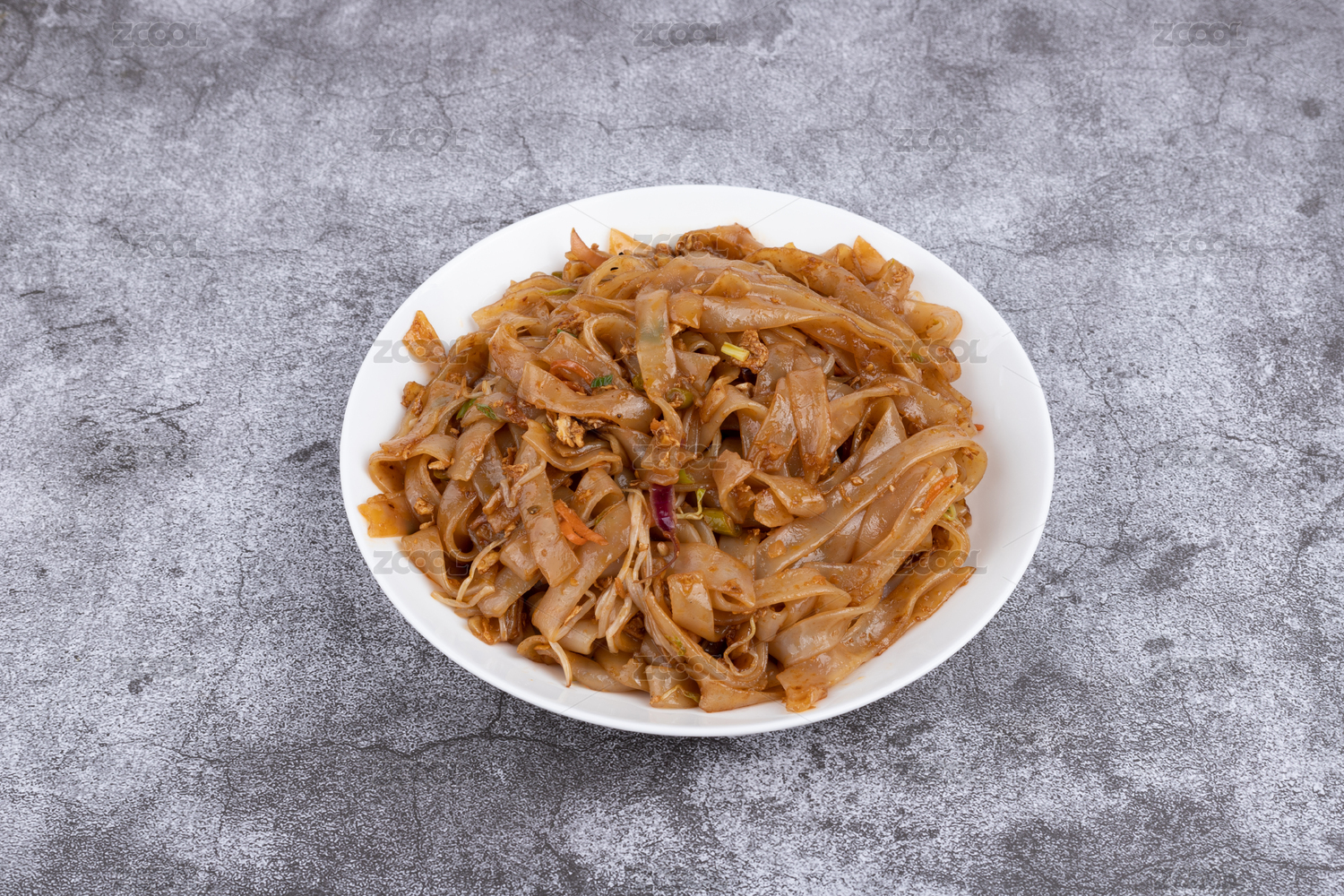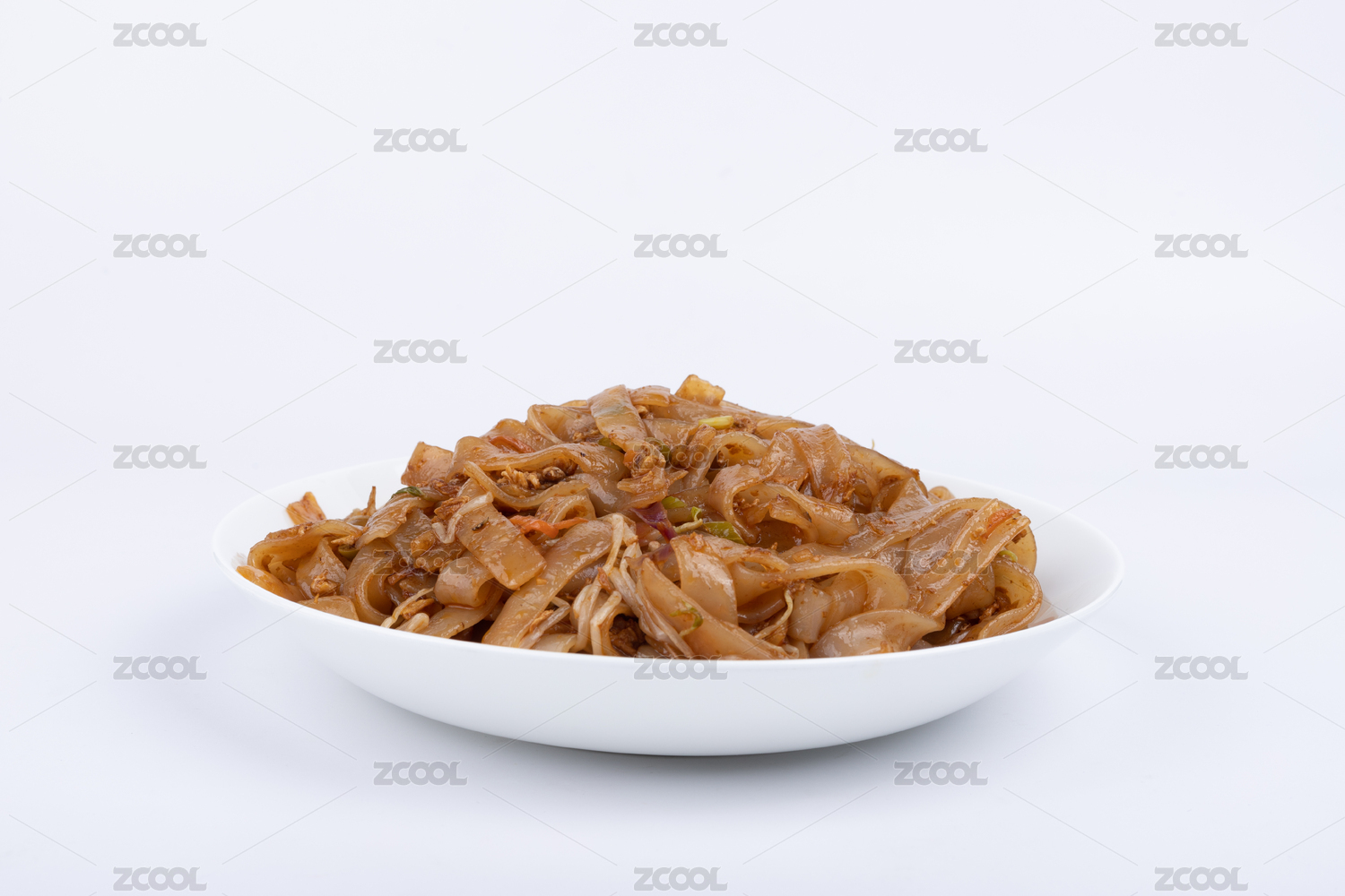 綠色背景白色盤(pán)子里剛烹飪好的粵式炒河粉