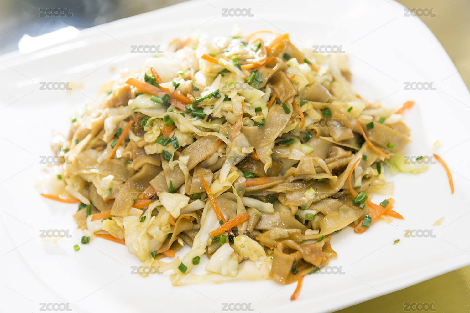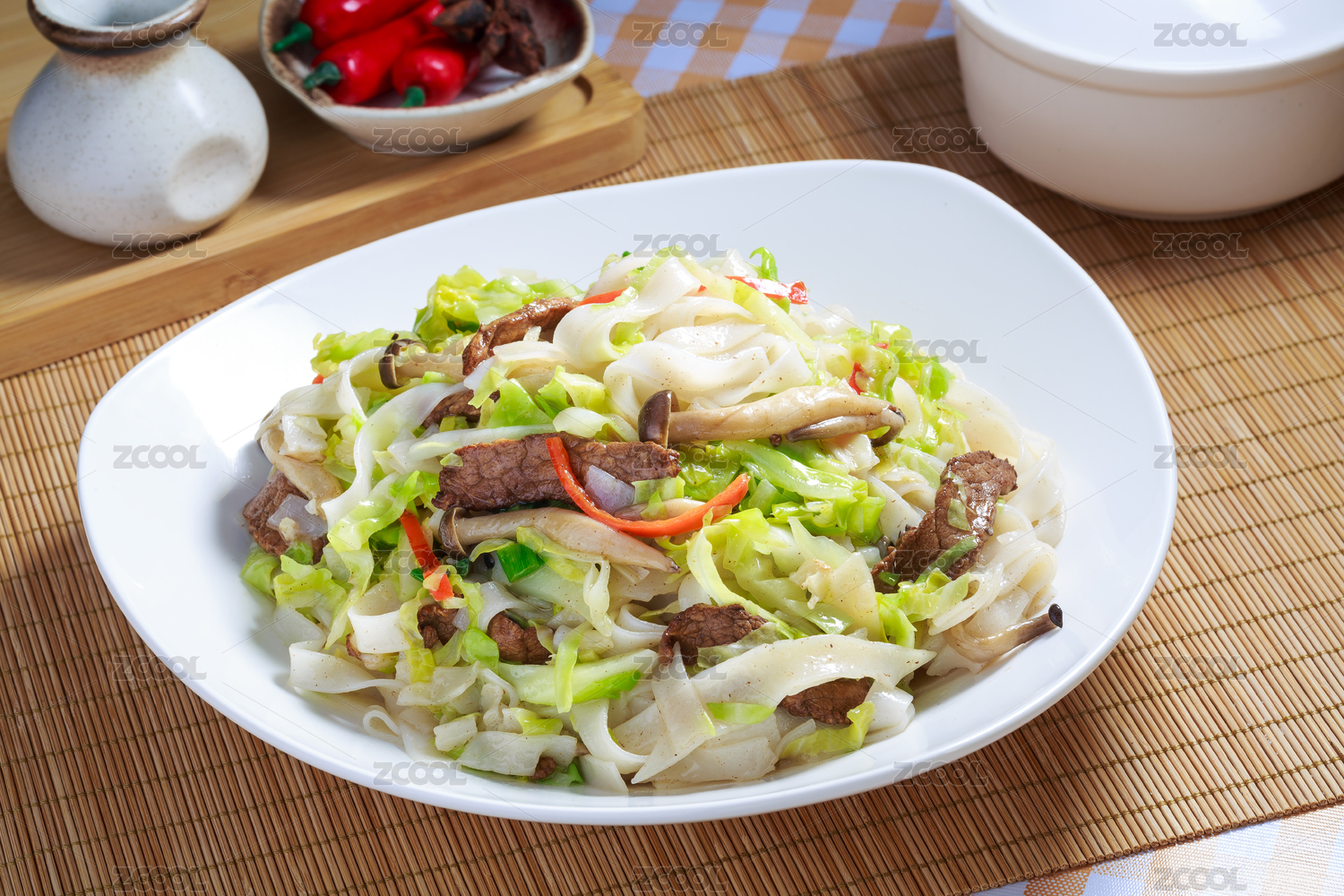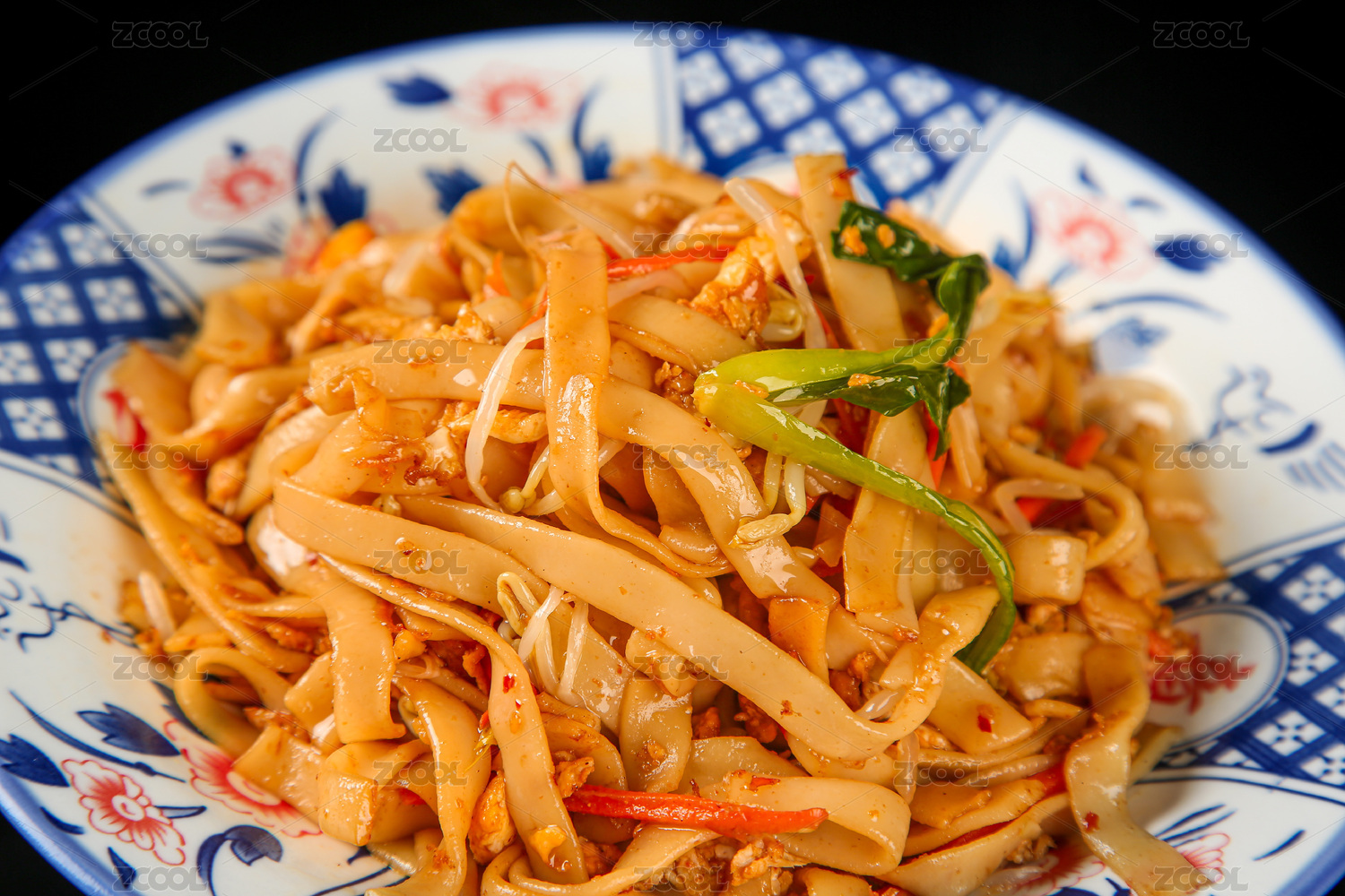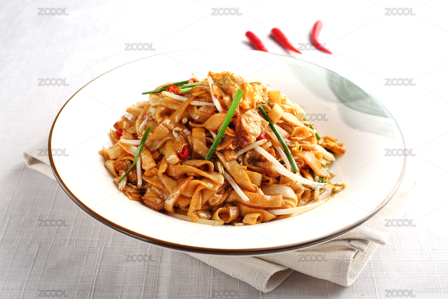 綠色背景白色盤(pán)子里剛烹飪好的粵式炒河粉