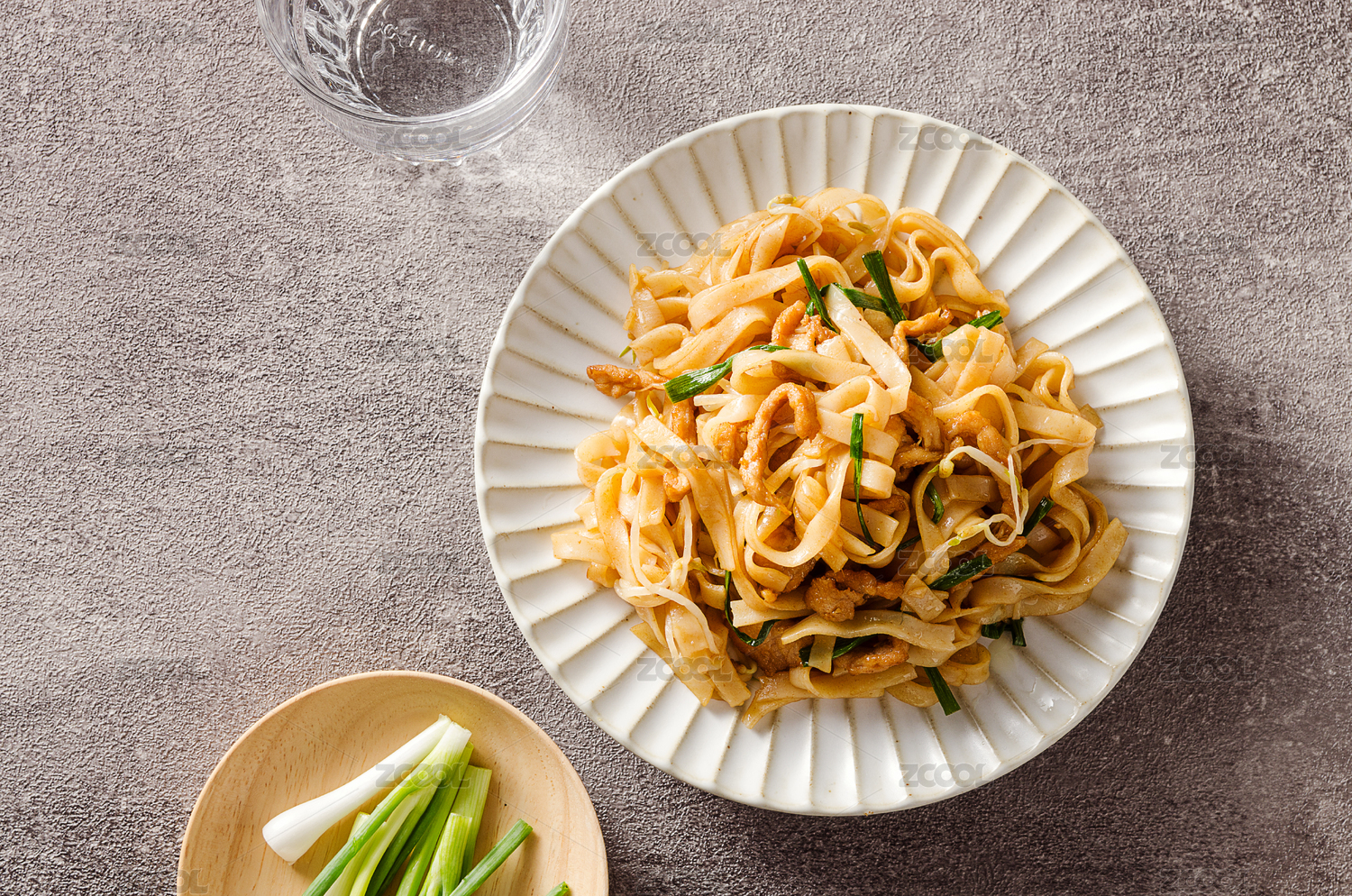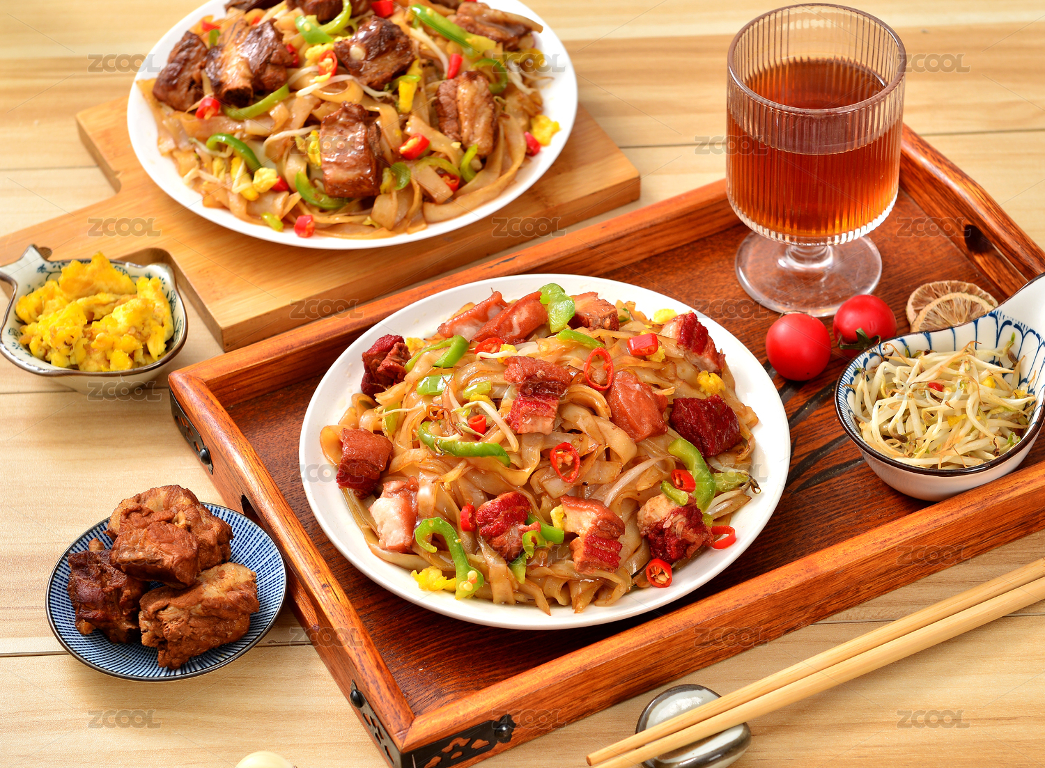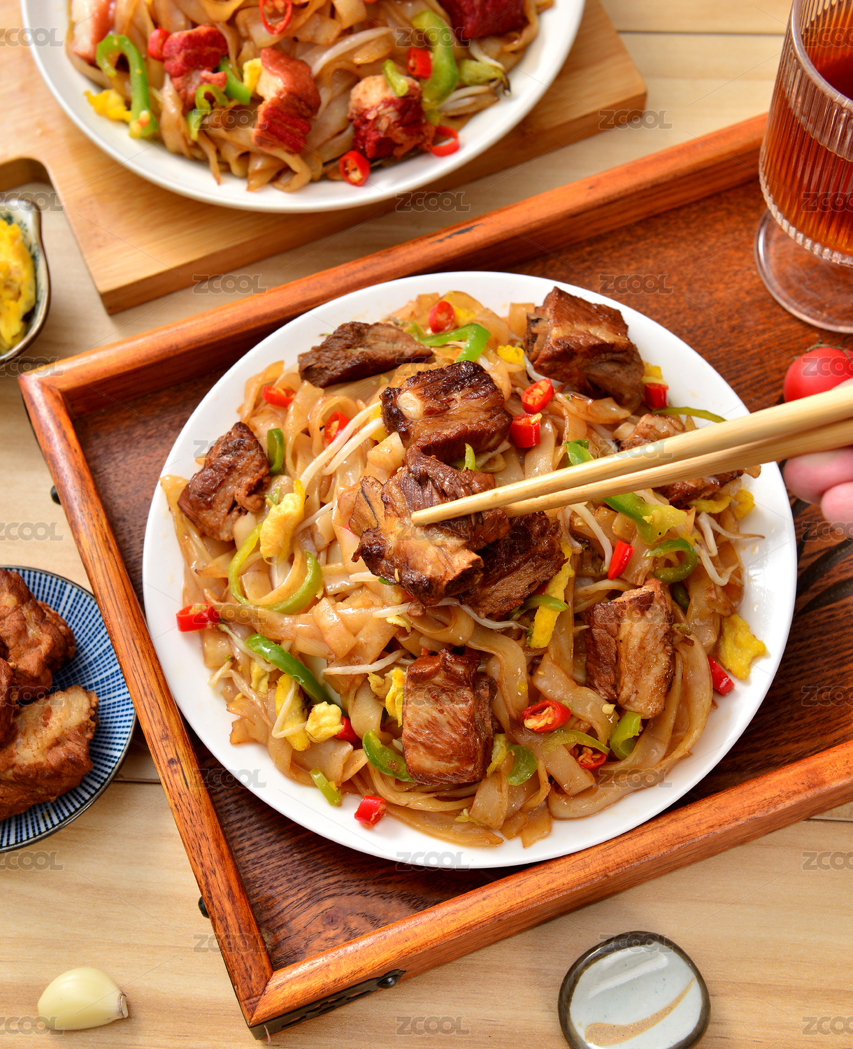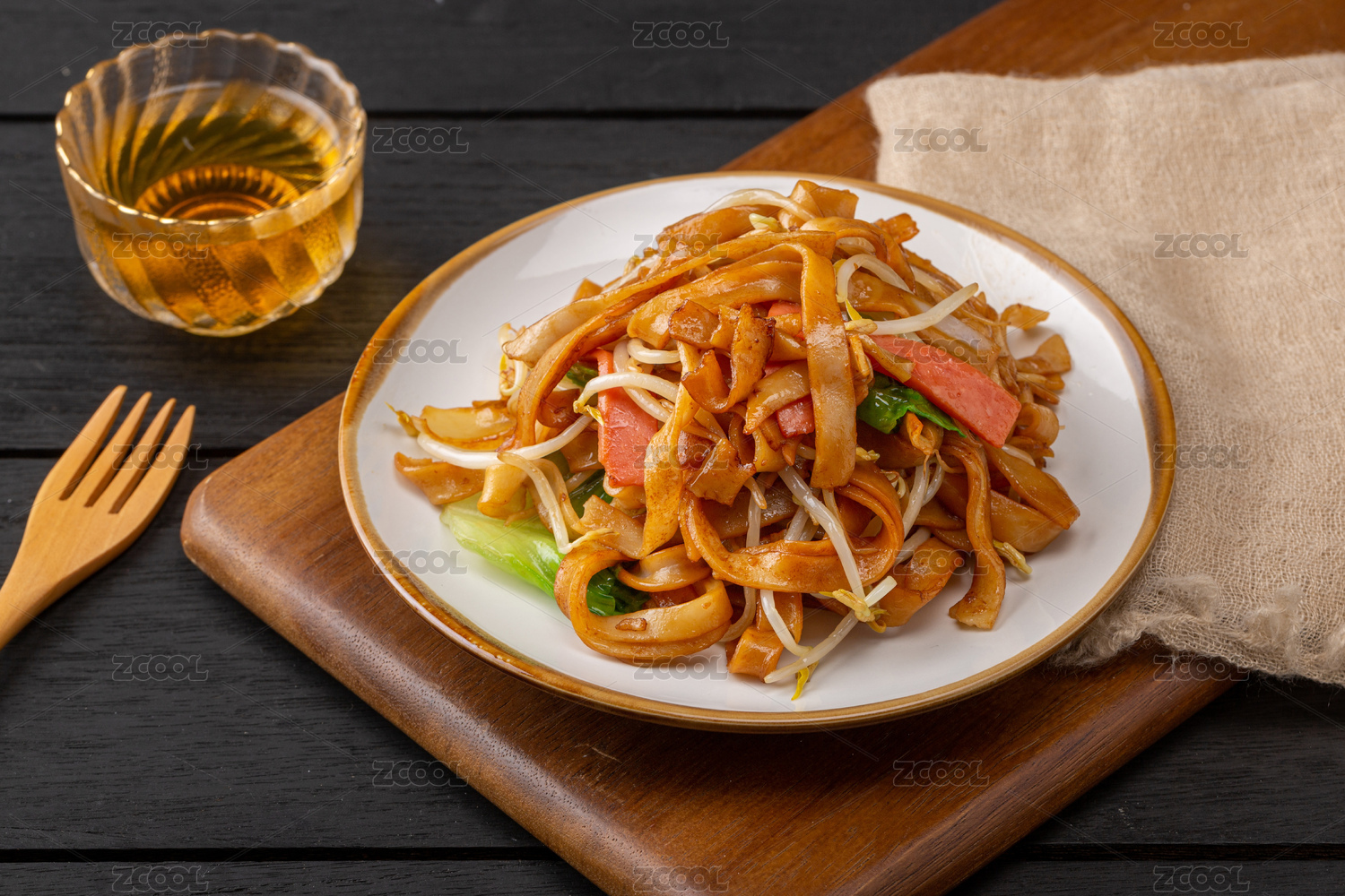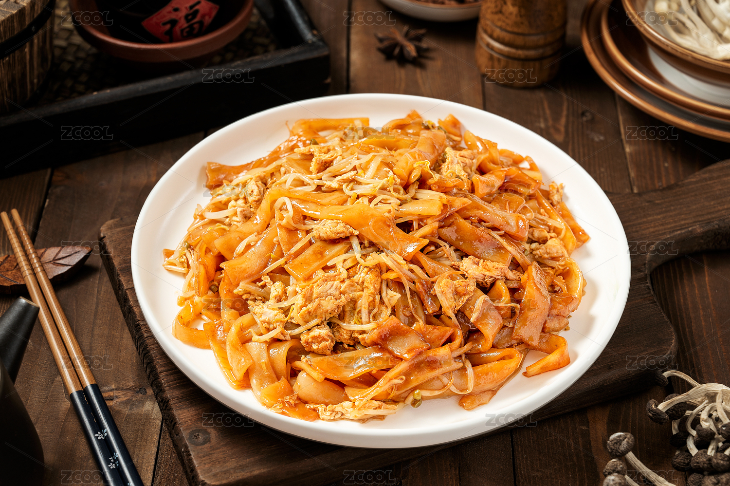 深色木板上擺放的炒河粉