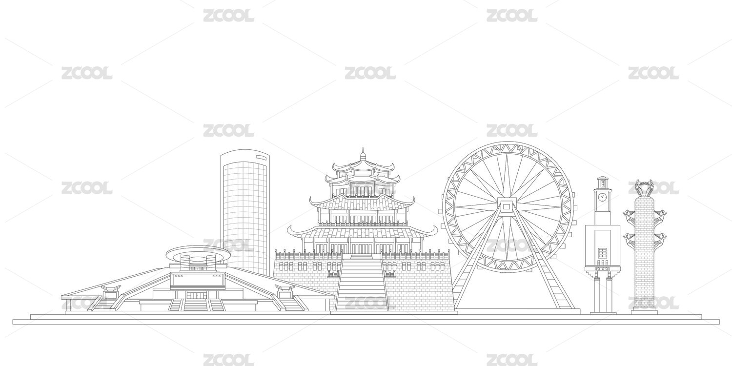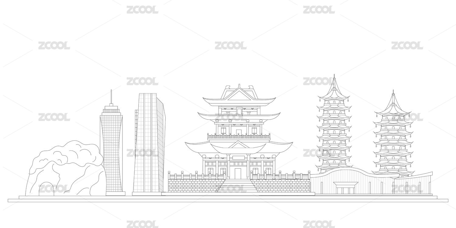 湛江中國(guó)風(fēng)黑白線條地標(biāo)建筑描邊插畫矢量