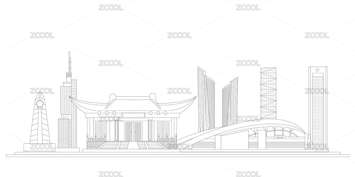 南京中國(guó)風(fēng)黑白線條地標(biāo)建筑描邊插畫矢量