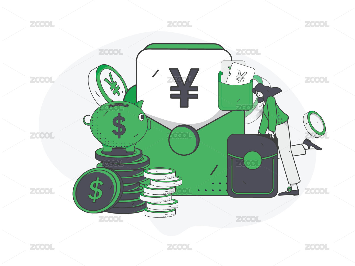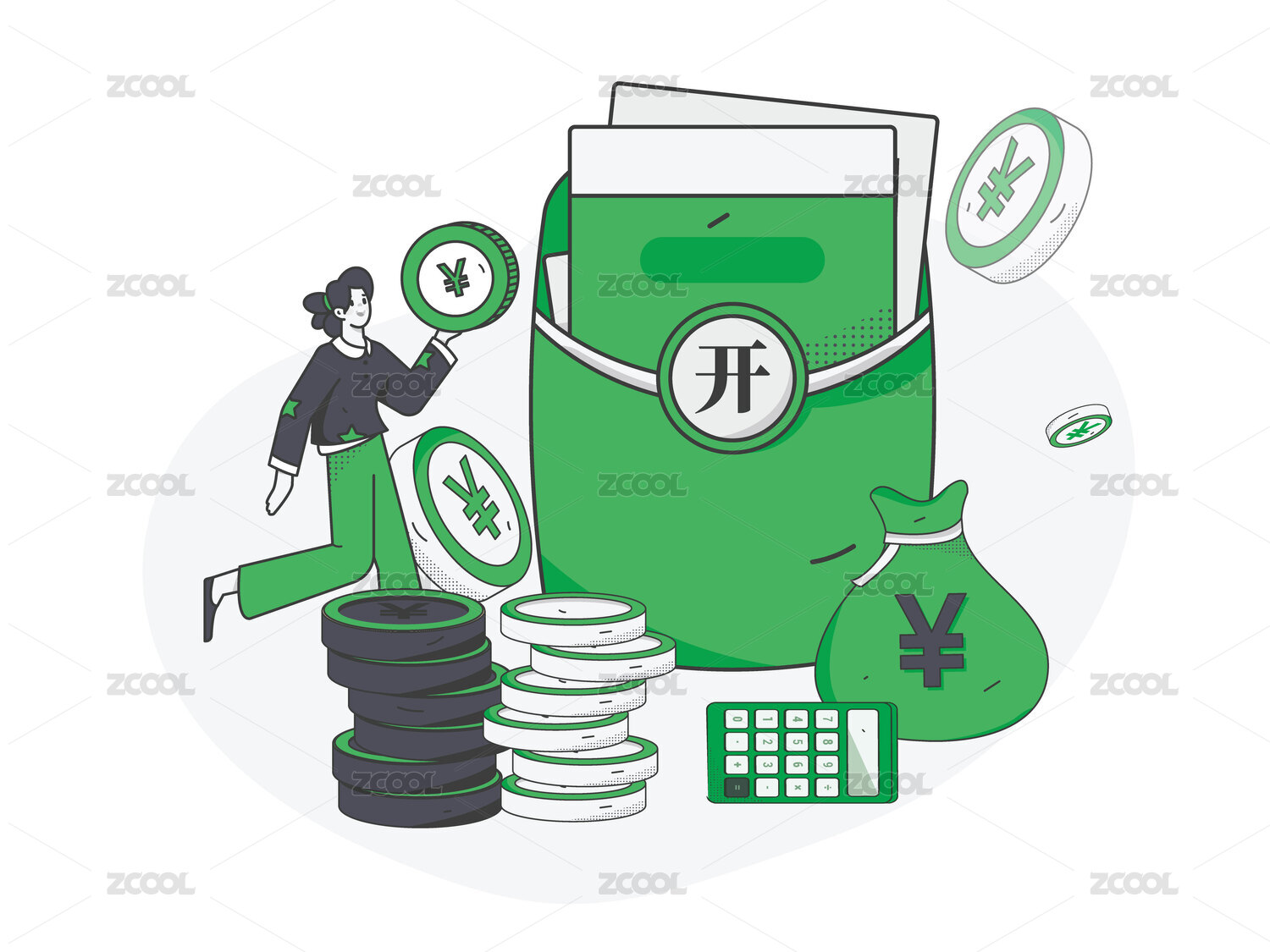 綠色描邊風(fēng)金融插畫矢量金幣紅包卡券