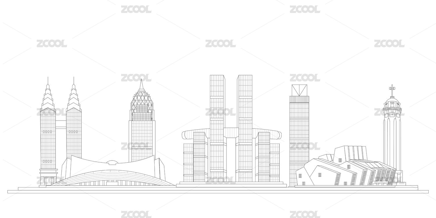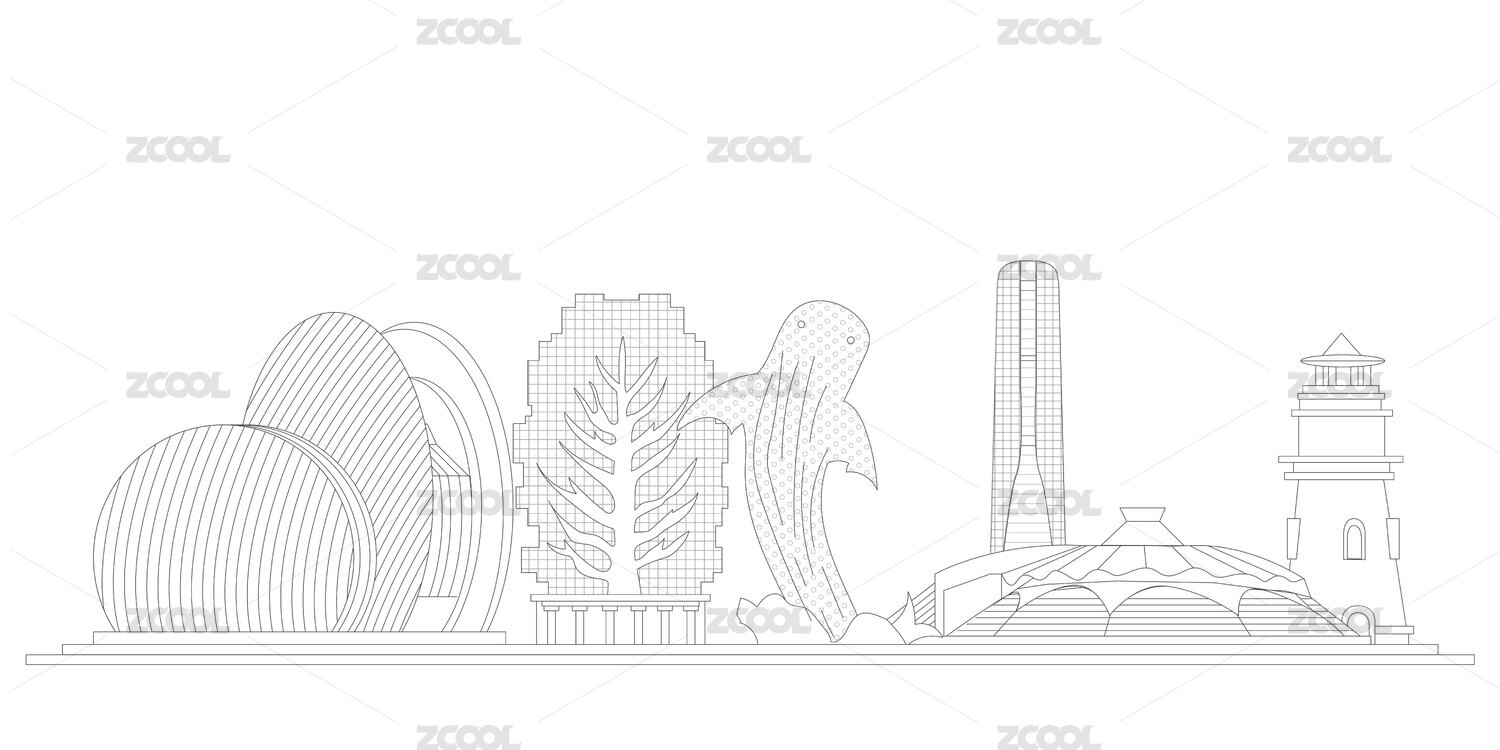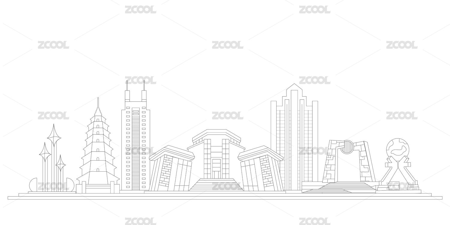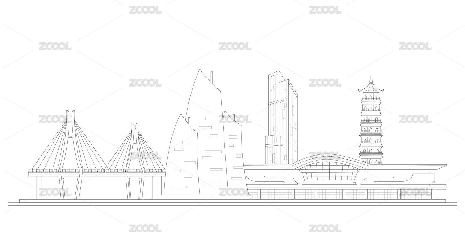 珠海中國(guó)風(fēng)黑白線條地標(biāo)建筑描邊插畫矢量