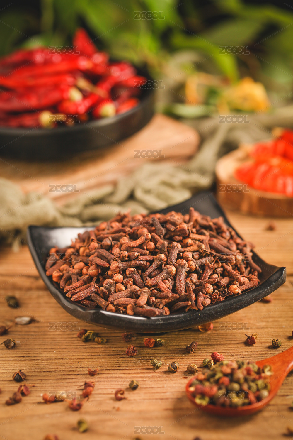 桌面上的盤子里的香氣四溢的丁香和白豆蔻