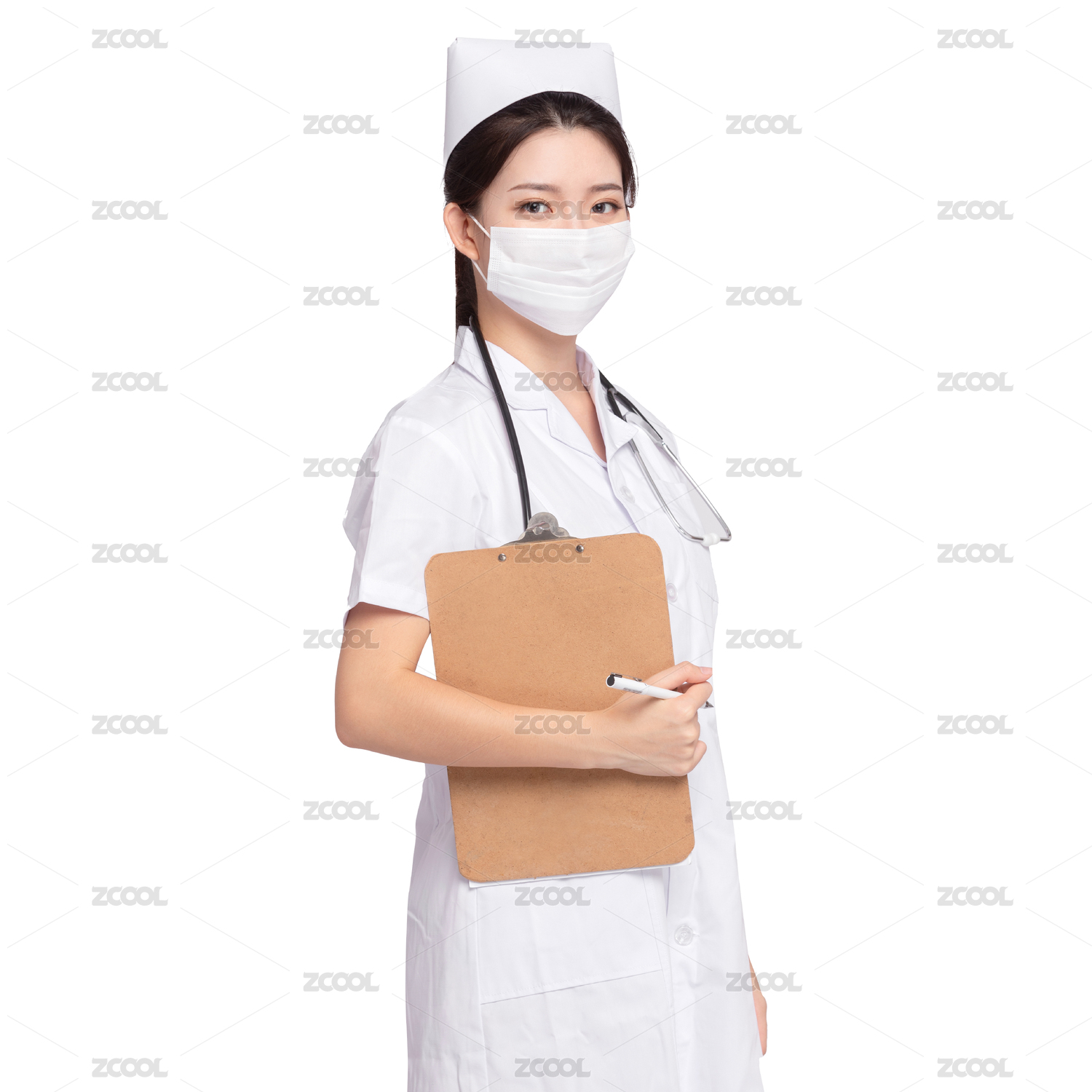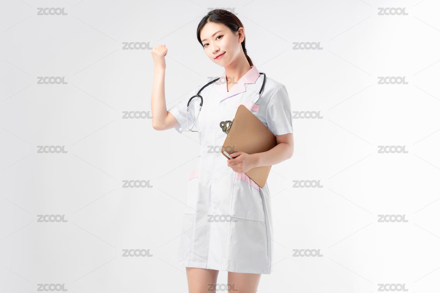 純色背景里,拿著文件夾的美麗的亞洲女護(hù)士