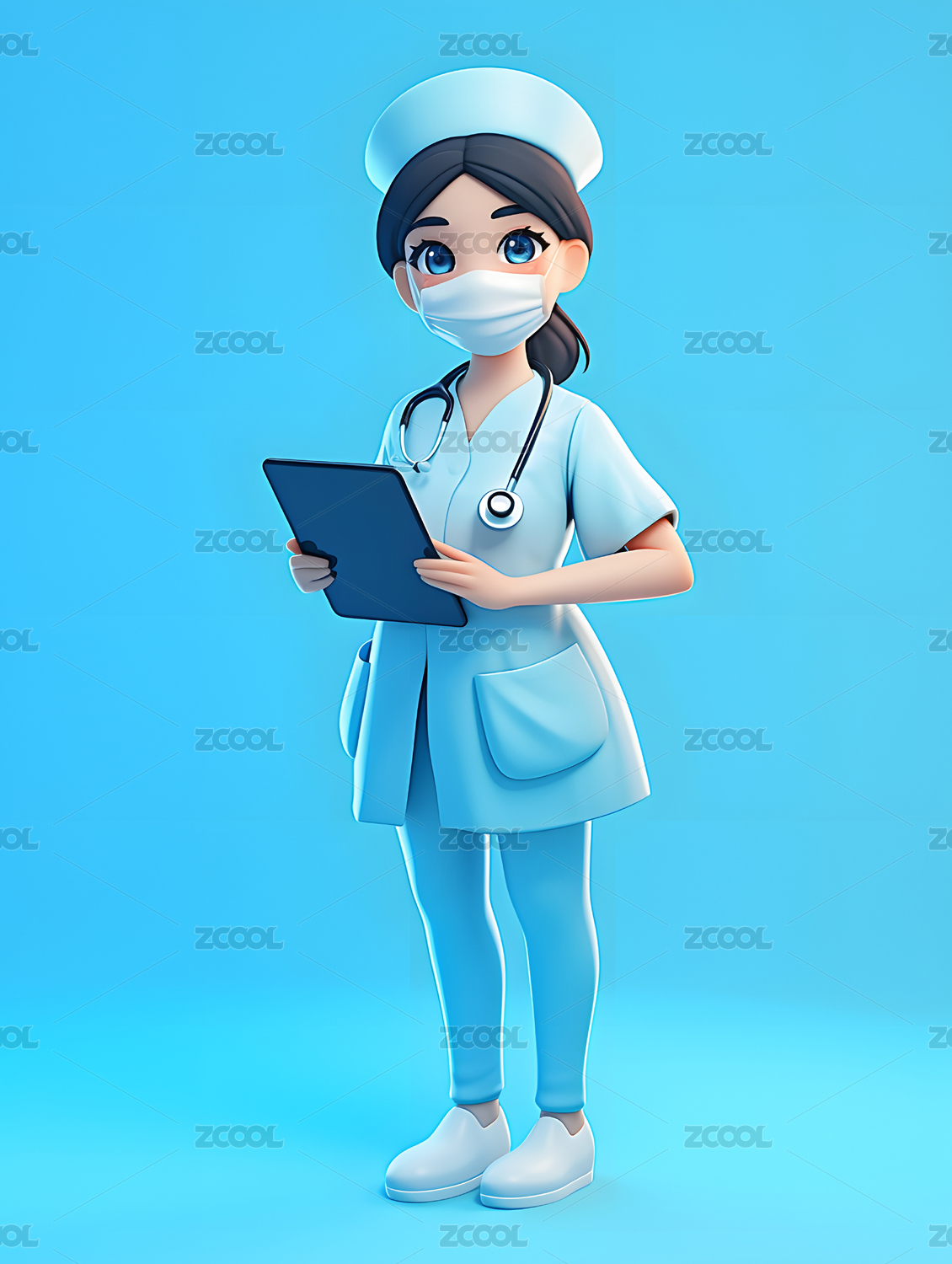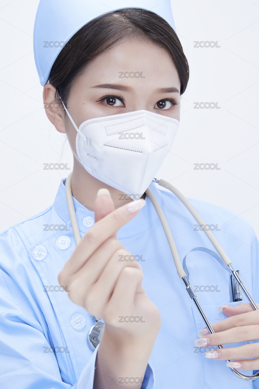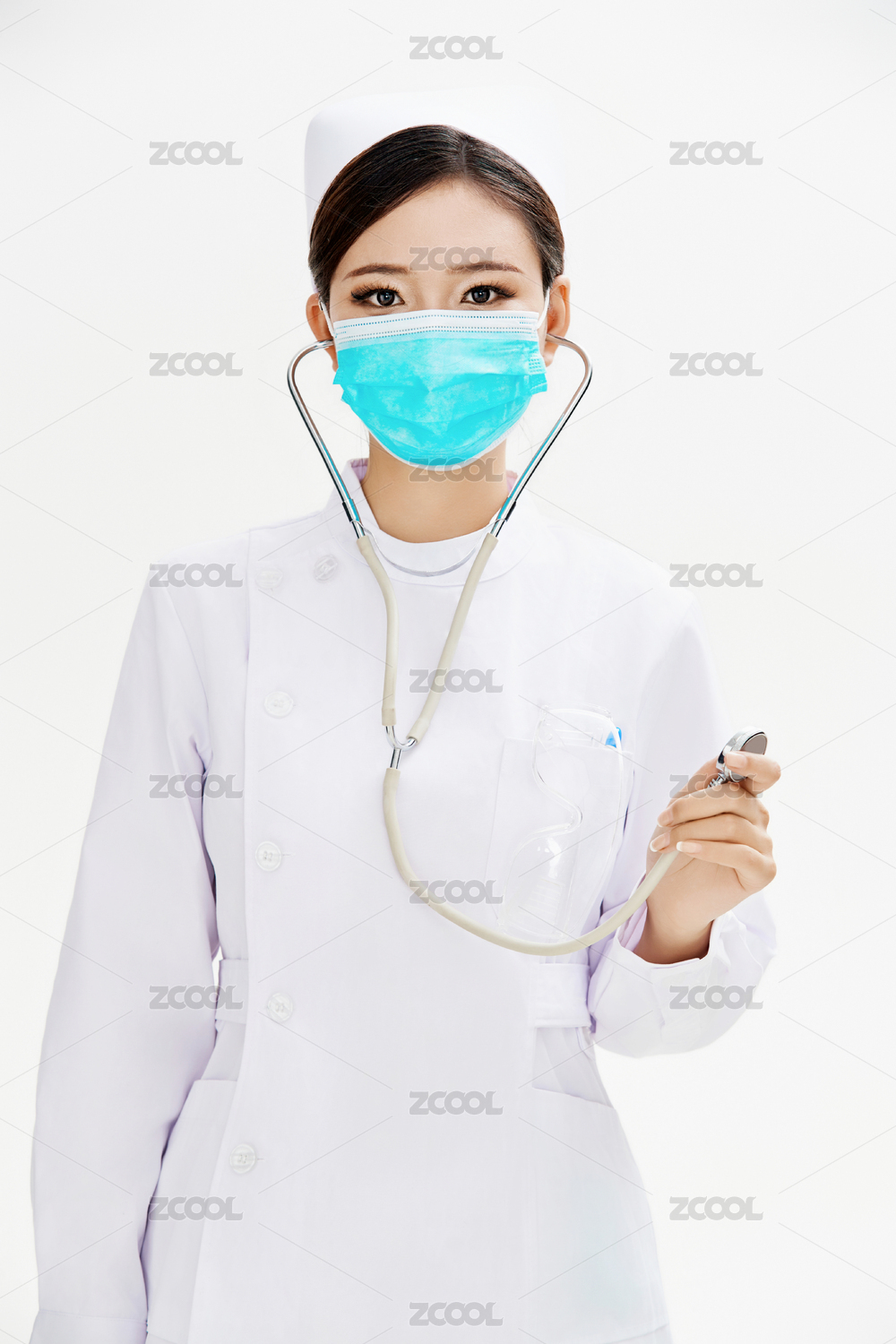 穿藍(lán)色護(hù)士服佩戴聽(tīng)診器口罩的女性醫(yī)護(hù)人員