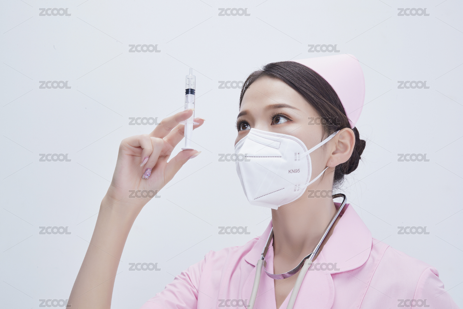 穿護(hù)士服戴聽(tīng)診器口罩手執(zhí)針筒的年輕女護(hù)士