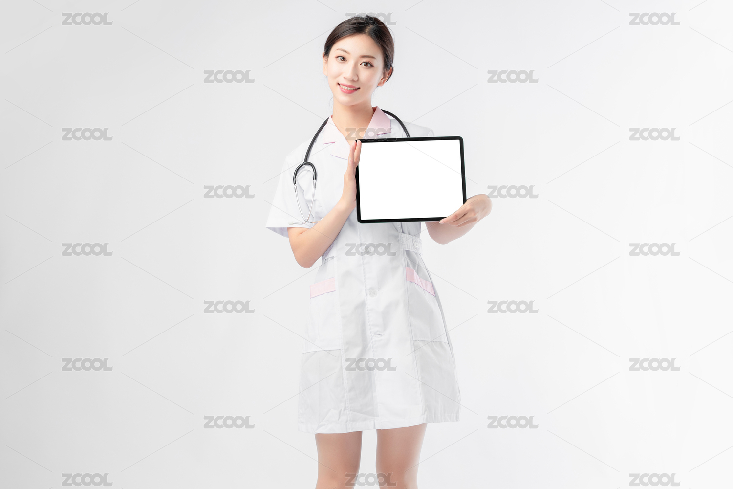 手拿平板電腦的女護(hù)士,正在展示屏幕內(nèi)容