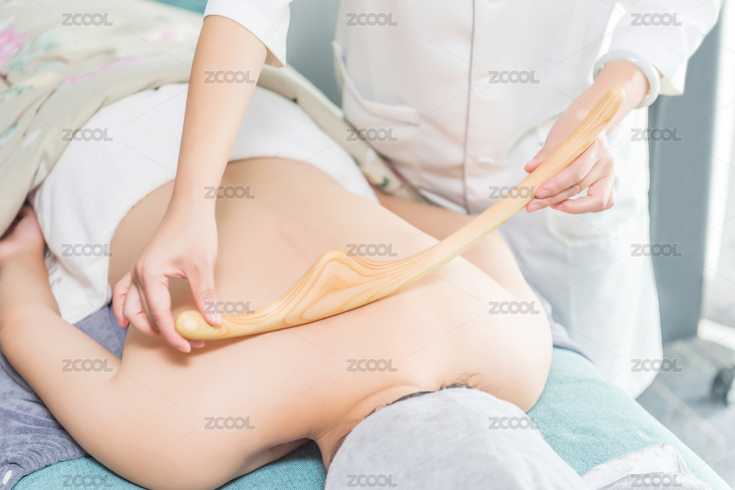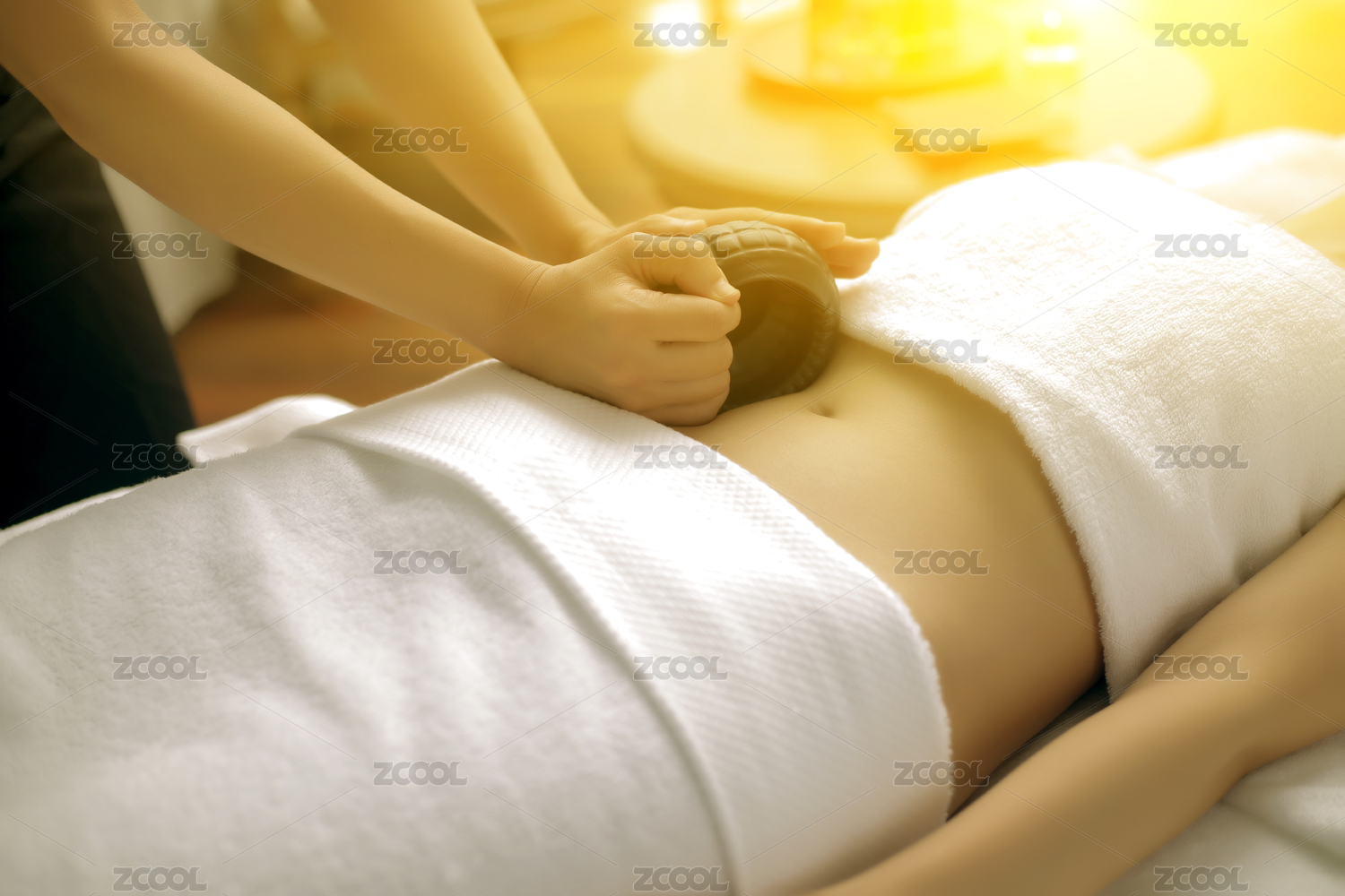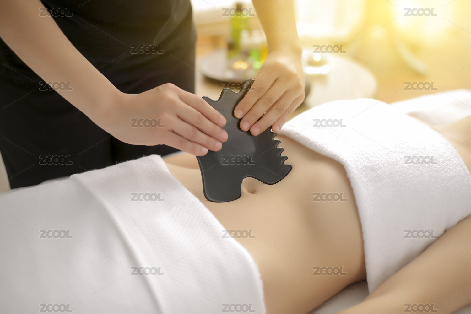 按摩師使用專業(yè)的工具幫助顧客按摩小腹