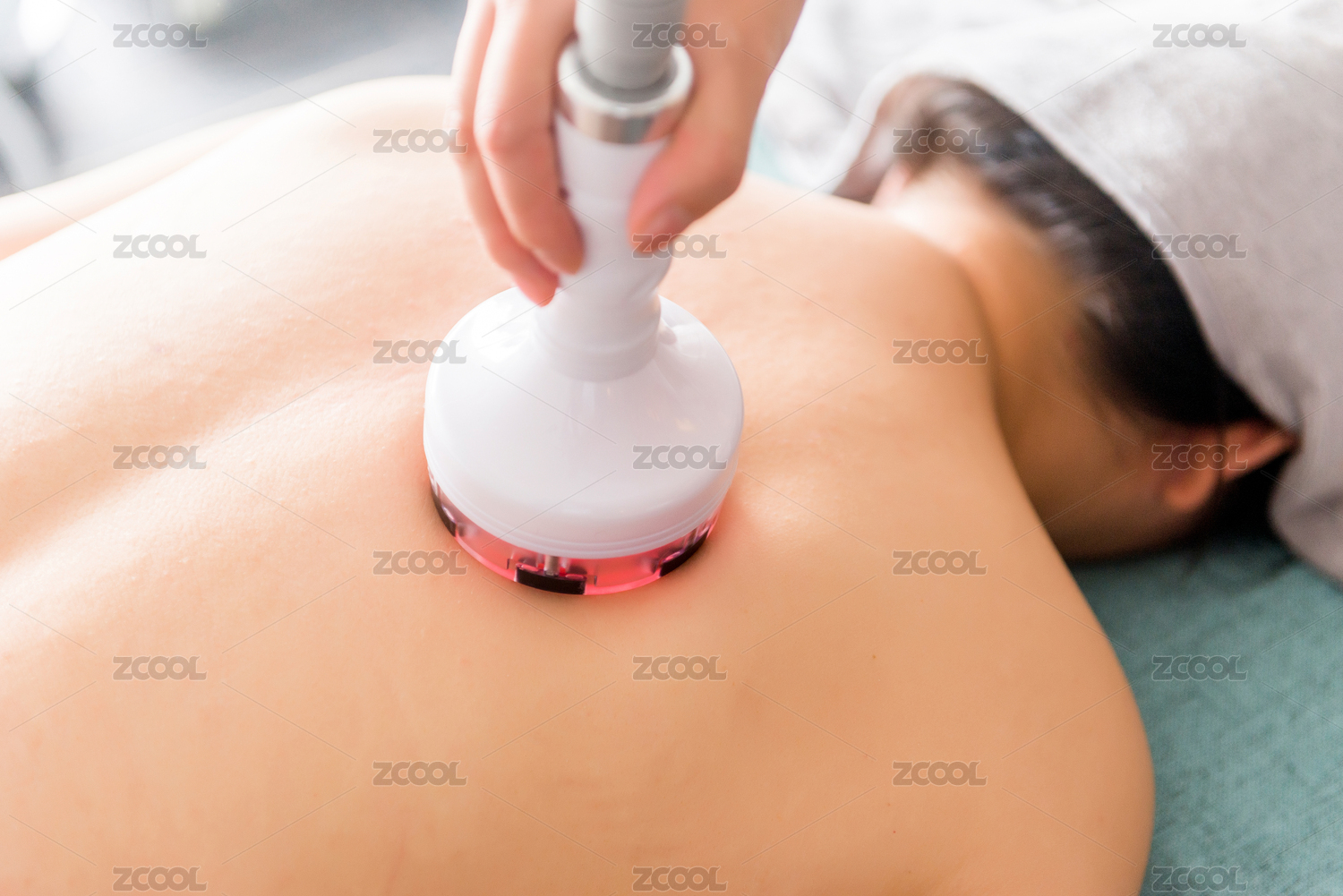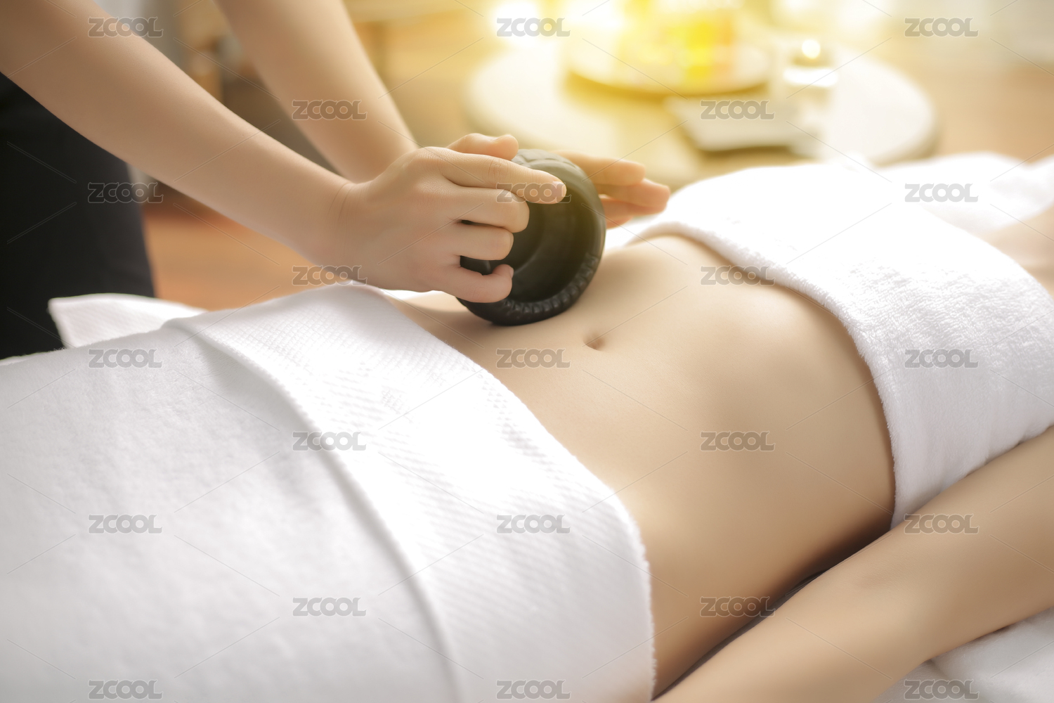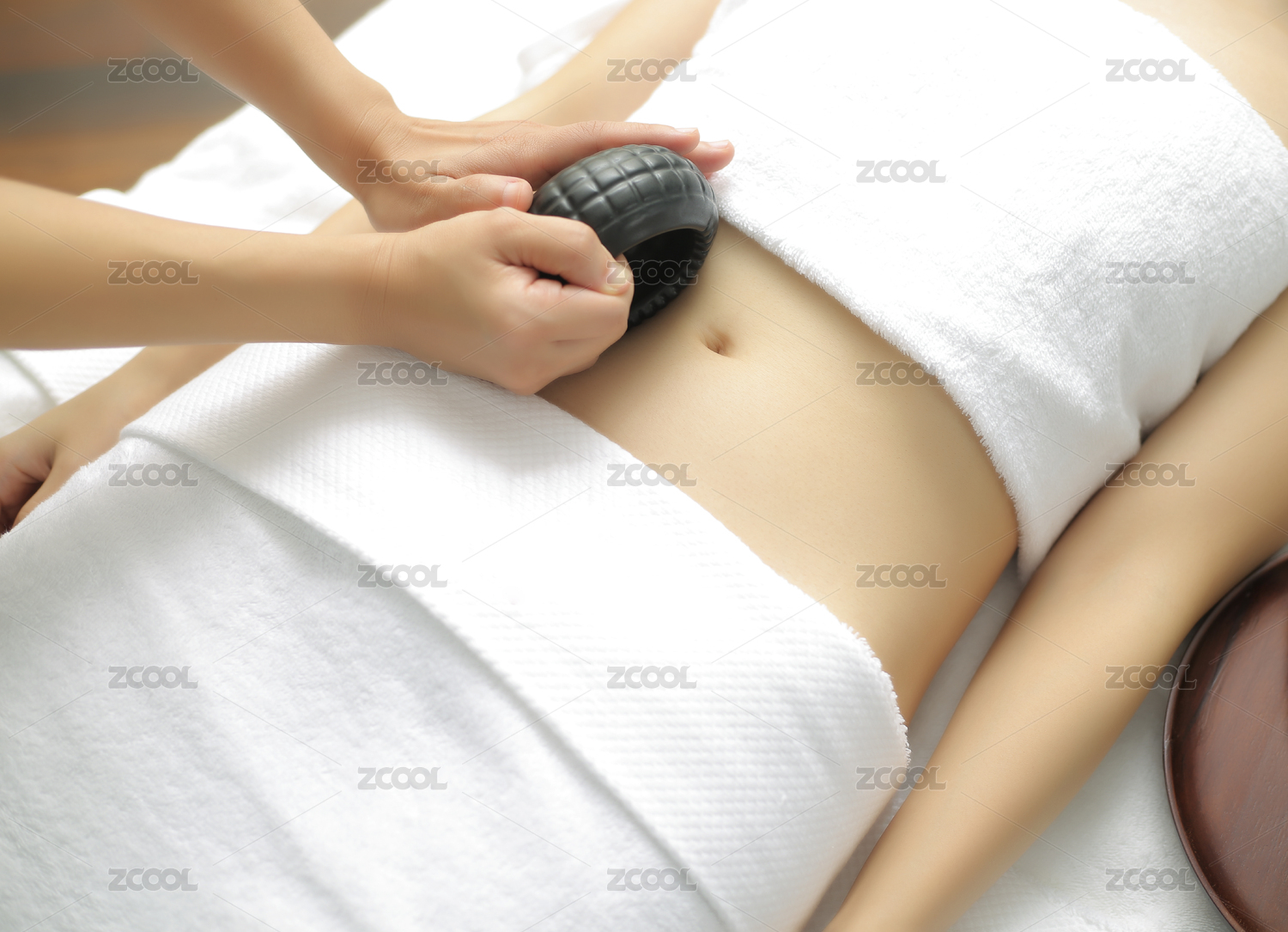 按摩師使用專業(yè)的工具幫助顧客按摩小腹