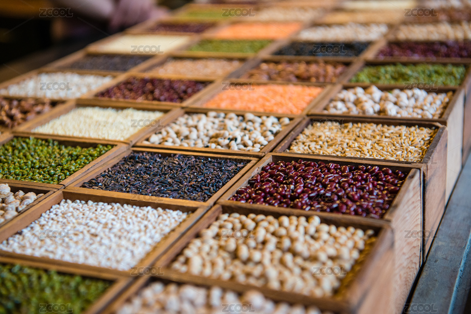 各種豆類上的棕色木箱豐富多彩的健康豆店為顧客挑選烹調(diào)或選取重點照片吃。